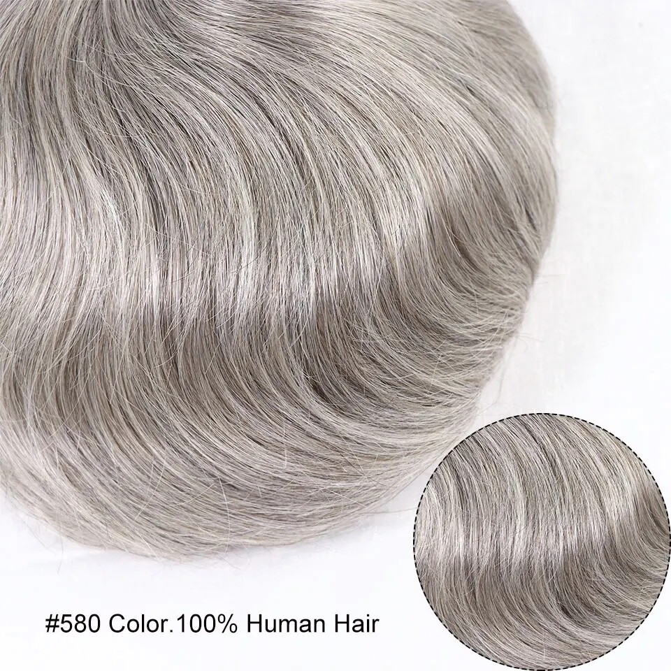 #580 Human Hair Mens Toupee Mono with Pu Replacement System Hairpiece Sliver Hair Grade Remy Hair Virgin Hair Yes Weight 75g Toupee Texture Straight/ Wave Toupee Design Right, Left Toupee Density 130% Toupee Base Thin Skin PU+Mono Lace Hair Length 6inch Human Hair Toupee Men Type 100% Human Virgin Hair Toupee Base size 8x10 Base Material French Lace Hair color #580 Hair type European Hair Toupee
