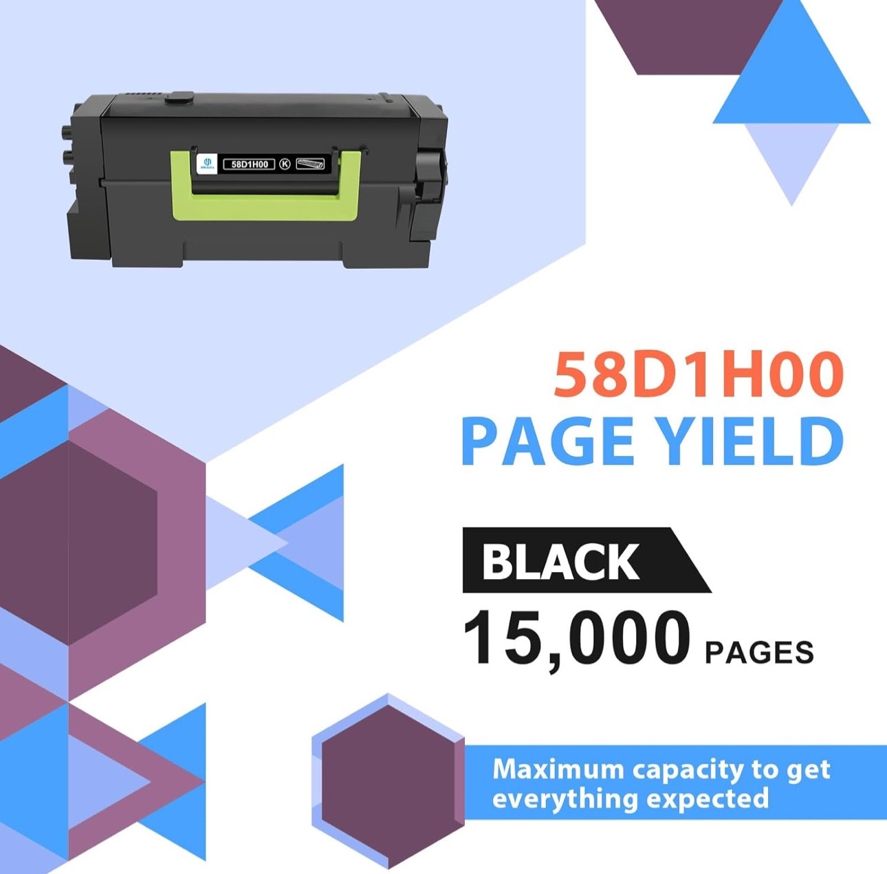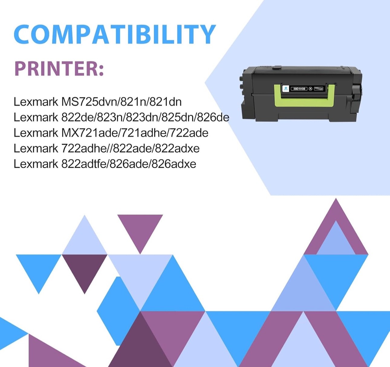 #2946 58D1H00 Black Toner Cartridge 58D1000 MS823dn Remanufactured Compatible for Lexmark MS823n MS821n MS821dn MS825dn MS826de MS822de MX822ade MX826ade MX721ade MX722ade Printer (15,000 Pages, 2-Pack) Brand inkalfa Color 58D1H00 58D1000 Black Toner Cartridge*2 Compatible Devices MS725dvn, MS821n, MS821dn, MS822de, MS823n, MS823dn, MS825dn, MS826de, MX721ade, MX721adhe, MX722ade, MX722adhe, MX822ade, MX822adxe, MX822adtfe, MX826ade, MX826adxe Manufacturer inkalfa for Lex-mark 58D1H00 black toner cartridge Inkalfa Compatible 58D1H00 toner Replacement for Lexmark 58D1H00 58D1000 black toner cartridge Package Contents: 2 Pack 58D1H00 58D1000 Black Toner Cartridge Compatible for Lexmark Printer: MS821dn MS821n MS823n M823dn MS825dn MS826de MS822de MX822ade MX822adxe MX822adtfe MX826ade MX826adxe MX721ade MX721adhe MX722ade MX722adhe MS725dvn Printer Page Yield: Up to 15,000 pages per 58D1H00 58D1000 Black Toner Cartridge(Letter/A4, at 5% Coverage) Excellent Performance: 58D1H00 black toner cartridge deliver superior printing results with vivid colors and clear prints Compatible for Lexmark Printer: MS725 MS821 MS822 MS823 MS825 MS826 MX721 MX722 MX822 MX826 Series Printer