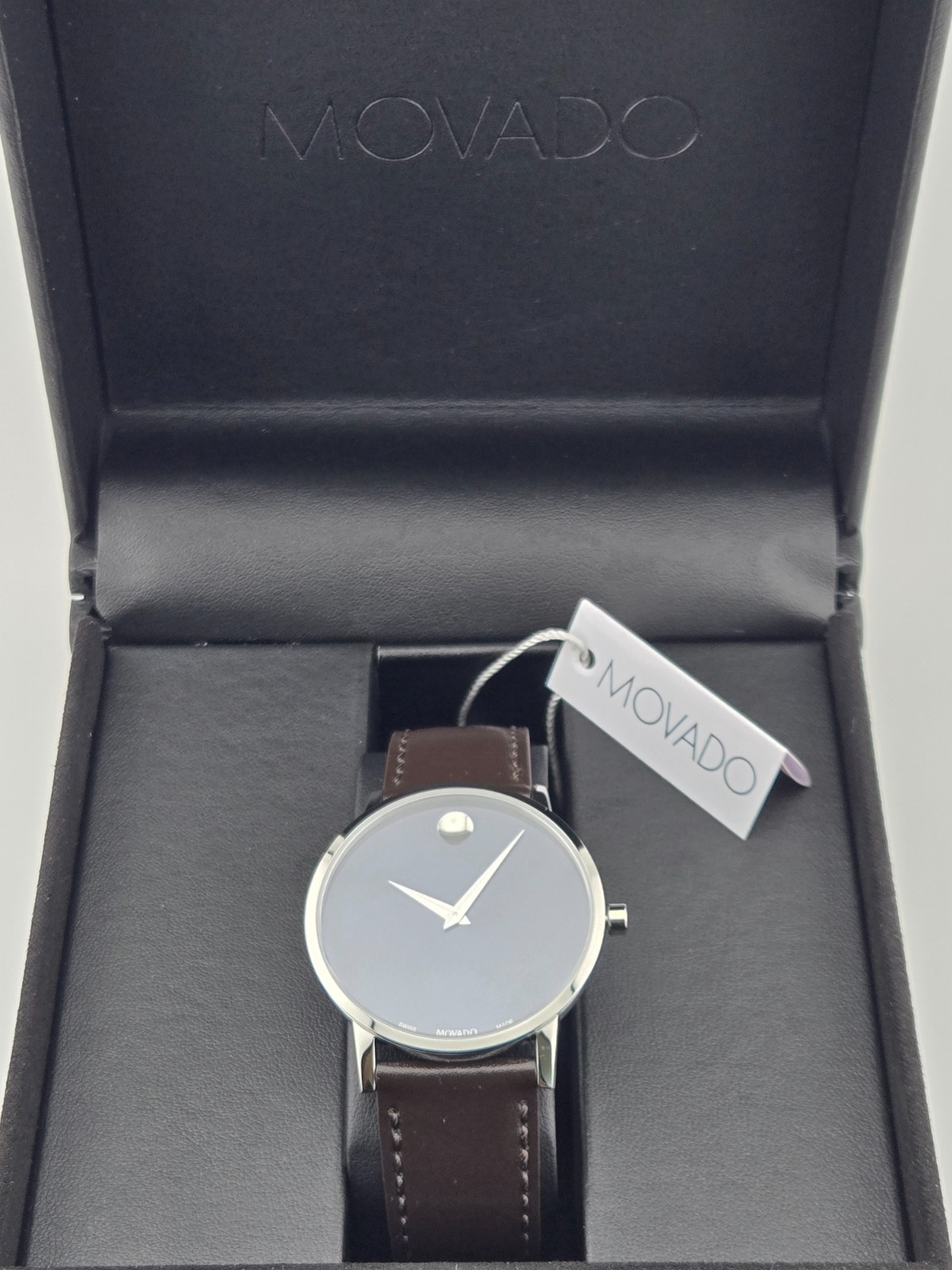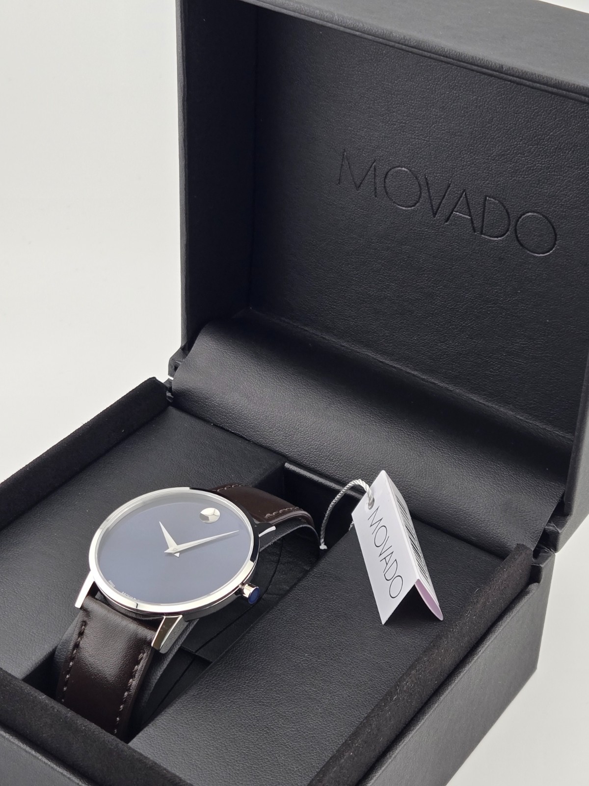 $595 MSRP | Movado Museum Classic Men's Blue Dial Leather Band Watch - 0607851 The Movado Museum Classic Men's Blue Dial Leather Band Watch (model 0607851) embodies refined sophistication and timeless design. Featuring a polished silver-tone stainless steel case and a rich brown leather strap, this watch pairs modern elegance with classic materials. The deep blue dial is minimalist and clean, adorned only with sleek silver-tone hands and Movado’s iconic dot motif at the 12 o’clock position—a hallmark of the Museum Classic collection. Equipped with a precise quartz movement, this timepiece ensures accurate and dependable timekeeping with effortless maintenance. The 40 mm round case offers a balanced, contemporary silhouette that sits comfortably on the wrist, while a scratch-resistant sapphire crystal maintains the clarity and pristine look of the dial. A traditional buckle clasp secures the strap for a classic, adjustable fit that complements both casual and formal wear. Water resistant up to 30 meters (100 feet), the Movado Museum Classic is suitable for everyday elegance, offering just the essential hour and minute functions. Its minimalist approach and striking color combination make it a standout piece for those who appreciate understated luxury. Whether worn in the office or out for the evening, this watch is a sophisticated reflection of Movado’s design legacy. Features Silver-tone stainless steel case with a brown leather strap. Fixed silver-tone stainless steel bezel. Blue dial with silver-tone hands. Dot motif at 12 o’clock position. Dial Type: Analog. Quartz movement. Scratch resistant sapphire crystal. Pull / push crown. Solid case back. Round case shape, case size: 40 mm. Buckle clasp. Water resistant at 30 meters / 100 feet. Functions: hour, minute. Fast and Free Shipping You're already purchasing the item. Why pay additional for shipping, especially slow shipping? We get your order shipped out within 1-business day and delivered to your doorstep as quickly as possible. Competitive Pricing With our dynamic pricing model, our prices are always competitive. Our prices are some of the lowest that you will find on the internet. Rest assured that you're getting a good deal when purchasing with us. 30-day Money Back Guarantee We are committed to making sure that you leave this transaction satisfied. If you're unhappy with the product for any reason, you may return it back for your money-back or a replacement within 30 days. No questions asked!