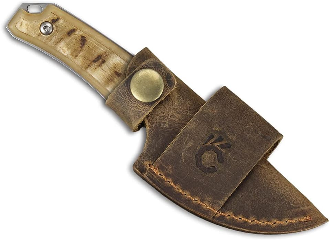 1.HUNTING SURVIVAL KNIFE: Simplicity and style meets unmatched function, no matter the application; An excellent hunting knife capable of countless tasks in the field. 2.440C STEEL FULL TANG: For first-rate edge retention and corrosion resistance; Drop-point with wide blade radius makes breaking down game a breeze. 3.NATURAL RAM HORN HANDLE: It's made from a cavel, Inlaid with black bone, each pair of handles is unique. 4.SUPERIOR TACTICAL USE: The full-tang, fixed blade construction provides enhanced stability when in use; Leather belt loop sheath for easy access; Lanyard hole for versatile carry options. 5.EVERYDAY CARRY: The perfect addition to your EDC collection, backpack, survival kit, tackle box, and more. Product Description HUNTING SURVIVAL KNIFE 440C STEEL FULL TANG Simplicity and style meets unmatched function, no matter the application NATURAL HANDLE Buffalo Horn Handle High Polished Wood Handle Ram Horn Handle Green Preal Handle LEATHER BELT LOOP SHEATH Unique crazy horse holster SUPERIOR TACTICAL USE EVERYDAY CARRY Description A full tang compact survival hunting knife, excellent hunting knife capable of countless tasks in the field. Leather belt loop sheath for easy access; Lanyard hole for versatile carry options. Each pair of handles is unique. The perfect addition to your EDC collection, backpack, survival kit, tackle box, and more. Mechanism : Fixed Action : Fixed Blade Blade Steel : 440C Steel Blade Length : 2.67" (6.78cm) Blade Thickness : 0.157" (4mm) Length : 5.98" (15.2cm) Length with Leather sheath : 6.69" (17cm) Handle Thickness : 0.58" (14.73mm) NOTE: Based on feedback from our customers, we have improved the tightness of the leather belt loop sheath. The product now has a very tight belt. It does not cause the knife blade to be exposed. The knife also maintains its balance when strapped to the belt.