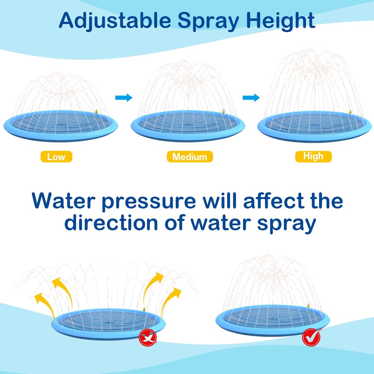 Fun Water Toys for Dogs and Kids: This is a fun water sprinkler for your dogs and kids, combined the best parts of a kiddie pool, water pool and water toys to make the most entertaining spray pad for kids on the market, a great alternative to your traditional swimming baby kids pool! when your lovely dogs and kids or toddlers, babies are bored in hot summer, why not take a dip in this cool pool, get relief from heat in hot summer, they will be excited to play in the sprinkle Safe and Robust Material: Your little one's safety is our top priority, this water sprinkler pad for kids and dogs is made of environmental PVC material, non-slip from BPA and phthalates, safe for daily use, 0.45mm thickness is 30% thicker than other splash pad, high quality edge sealing technology makes it not easy to burst 59” Large Size Water Park: The 59inch splash pad for dogs and kids is spacious enough for 1-2 kids with your dog, babies and pets can play in this outdoor sprinkler pad at the same time, an accurate outdoor toys for children parties in this summer that can entertain your dogs and kids at once, suitable for lawns, gardens, swimming pools, parties, or celebrations, outdoor beach lawn toys and summer pool parties Easy to Set Up and Storage: Plug it to any garden hose or PVC tubing and you will get a blow up pool, simply adjust water pressure to control the height of water streams, when you’re done, easily drain the water, wash the splash mat and hang it over to dry Warm Tips: Please trim your pets’ nails before use this water pad for dogs and cats and other pets, recommend the kids who over ages 3 years old and children must be accompanied by adults, please inject the water slowly and gently to fullness, If you have any questions about this sprinkler pad, please feel easy to through amzon message.