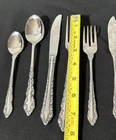 59 Pc National Stainless NS Illusion Scroll Gothic Dinner Dessert Set In Case All approximate measurements in the pictures 13 teaspoons 10 salad forks 12 dinner spoons 11 dinner forks 11 dinner knives 1 sugar spoon 1 butter knife Good vintage condition . Minimal signs of wear and use, minor scratches. The case has many signs of wear and tear, scuffs, scratches, and discolorations. The bowl of the sugar spoons has some light discolorations. Please study pictures carefully before purchasing Feel free to ask us any questions. Thank you for visiting our store! Shlv