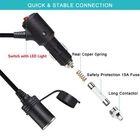 12V Car Cigarette Lighter Extension Cord with On Off Switch ; Cable Spec: 18AWG/2C, Length: 5FT( 60 IN) Max Current: 15A; Suitable for voltage: DC 12V to 24V; Built-in 15A fuse for safety. 【With ON & OFF Switch】The on/off switch is designed for quick connection and disconnection, which is more convenient to use. Compared with the cable without switch, it is safer and reduces the wear of the interface during the plugging and unplugging process of the cigarette lighter. 【Power Indicator Light】Our switch is a switch with light. When you press the switch, the built-in indicator light will light up, indicating that the power is successfully connected. With helpful LED light so you know when it has power that makes a good connection with your cigar lighter connector. 【Built-in 15A Fuse】Cigarette lighter male plug built-in 15A fuse for safety, protect your car and devices from over current and short circuit. 【Air Compressor Extension Cable】12V extension cords as extension for air compressor, so was able to plug the air compressor to the rear cigar lighter and to inflate the front tires on a car, work great on your car / motorcycle air pump. 【Wide Applications】12v car charger extension cable widely use to extension for 12 volt tools, such as portable DVD player,CD player, 12v car fridge,radar detector,tire inflator, add the extra length provided from the car 12v power port. 30days return and exchange freely, If for any reasons you are not satisfied with our product or service, please contact us first, we will support you friendly customer service.