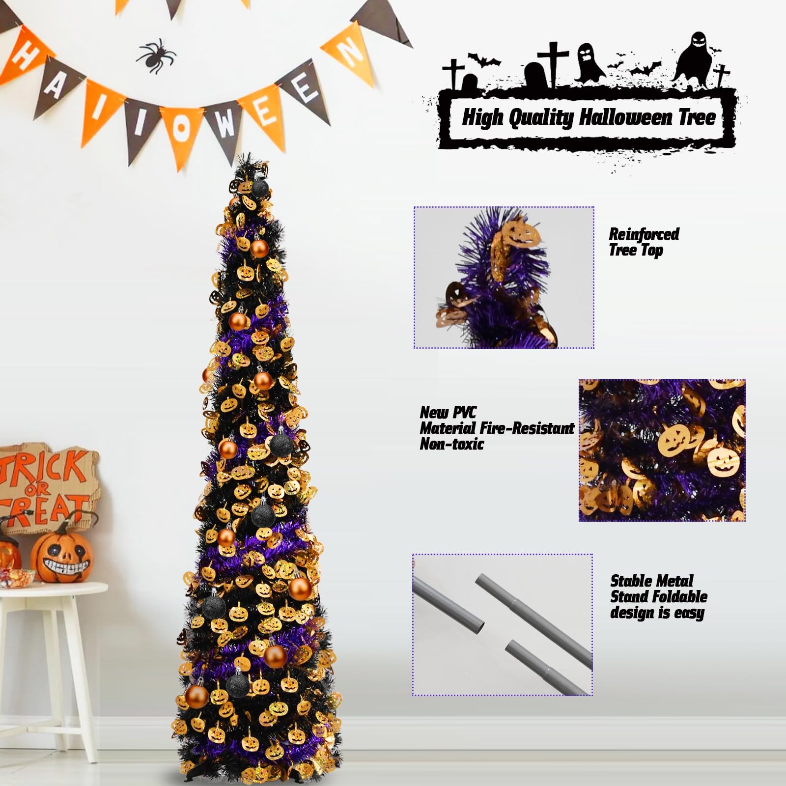 Christmas Halloween tree Effortless Setup & Storage: Designed with convenience in mind, this tree features a pull-up design that requires no tools—assembly takes just two minutes! The collapsible metal stand is not only sturdy but also reusable, making it easy to set up and pack away in a compact box for next year’s festivities. Versatile Holiday Decor: Standing at 5 feet tall, this tinsel Christmas Halloween tree pop up tree is the ideal addition to any space—whether it’s your porch, living room, bedroom, office, fireplace, backyard, terrace, or garden. It instantly elevates your holiday ambiance, lighting up any corner of your home with festive cheer. Space-Saving Design: With its slim profile, this tree fits seamlessly into small spaces, making it an ideal choice for those who want to maximize their living area without compromising on holiday cheer. Premium Quality: Crafted from high-quality PVC and metal, this pop-up Christmas Halloween tree pop up tree is built to last. The sturdy metal stand, coupled with a robust four-leg base made of thick plastic, ensures enhanced stability and durability. Thoughtful Gift: Surprise your friends or family with this unique tinsel tree! It's a delightful gift that’s sure to bring joy and laughter to any home, office, or outdoor gathering. Watch as everyone’s faces light up with holiday cheer when they see this shiny, charming tree surrounded by gifts.