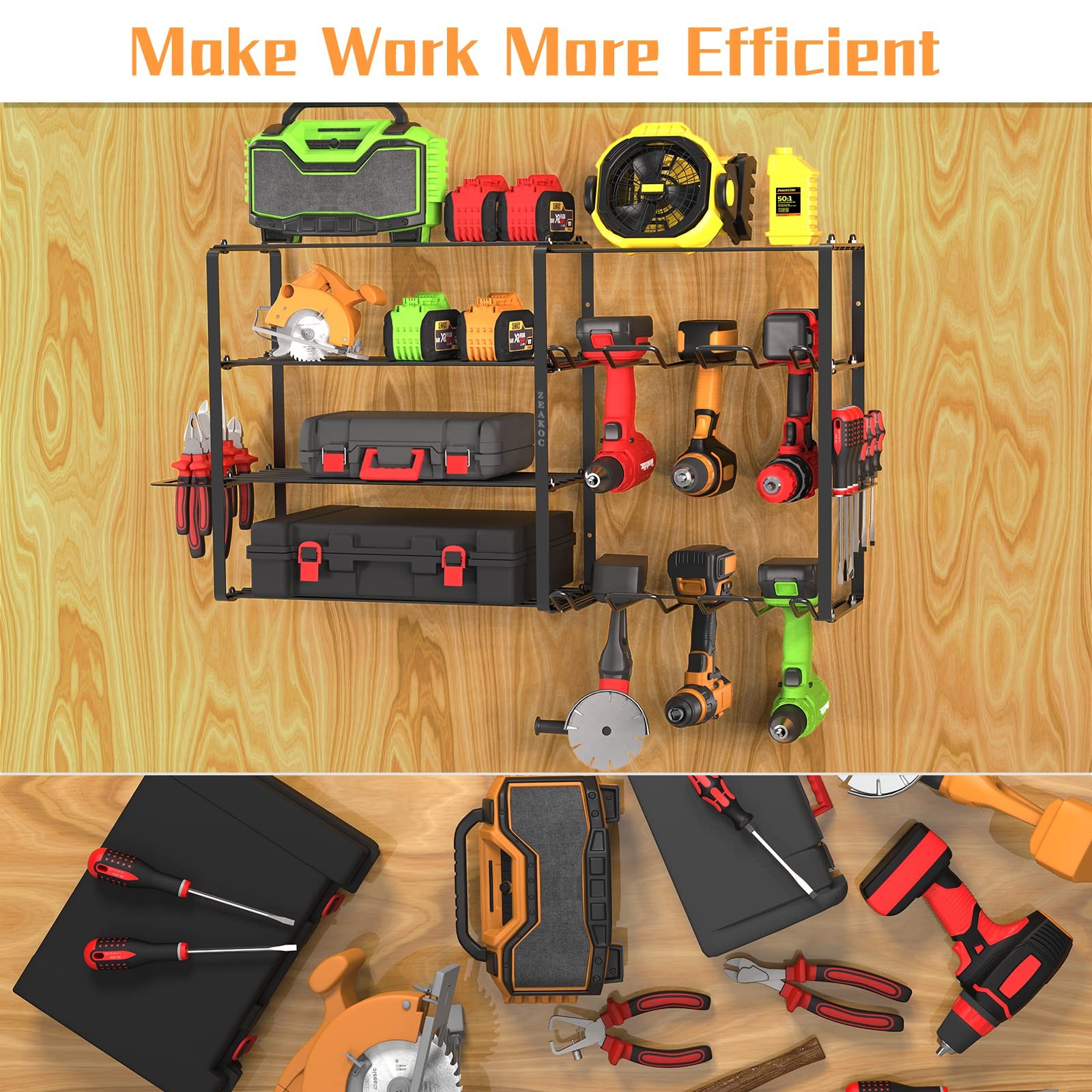 power tool organizer is designed with separate assembly. 5 storage shelves on the left, 6 tool hanger on the right, can make your work area neat and beautiful. It makes us more efficient. 【Clutter-free & more Efficient】Still struggling to find your tools all over the place or nowhere to put them? tool organizers provide efficient storage for your ryobi tools or cordless power tools, batteries and chargers,screwdrivers and hammers. A clean and tidy workplace makes you more comfortable and productive. 【Compact Steel Design, easy to install】power tool organizer is Compact Steel Design,you just need to screw and drill the holes,is that easy. 5 storage shelves on the left, 6 tool hanger on the right, can make your work area neat and beautiful. It makes us more efficient and makes visitors say Wow! 【5 shelves, 6 drill holders, bigger to hold more】tool rack overall size 29.6"x7.5"x16.5" (W*D*H) to store more equipment. The drill rack is able to be mounted on studs with 16 inch centers.Each rack can hold 3-4 chargers with good space and size, so items are not crammed together and limit use. It has plenty of room to store garden, snow blowing, multi-tool batteries, and cordless handheld household tools. 【Heavy Duty, High Quality】Our tool organization and storage are made of high quality DIA 1.57"-2.36"carbon steel,net weight up to 9.37LBS.Each shelf has a load capacity of up to 80-260Lbs,depending on the load bearing wall.Each drill holder has a load capacity of 20Lbs and is spaced 1.65" apart for easy hanging.Sprayed with a layer after electric surge, our tool holder provides more wear resistance. 【Good product, less troubles】tool organizer wall mount, quality assurance, more comfortable in use. Buy a practical tool organizer for your husband, father or friends,they'll love it. And if you have any questions, please contact us first, we will give you a satisfactory solution.