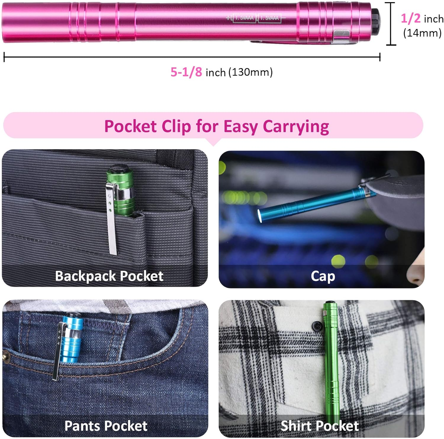 Store New Arrivals Add to Favorite View Feedback Contact 5-Pack LED Penlight Set with 10-Piece Pre-Installed Batteries, Aluminum Handheld Flashlights with Clip for Night Walks, Inspection, Emergency Description Light Source Type LED Item model number S00541 Style 5-PACK Power Source Battery Powered Battery Cell Composition Zinc Carbon Country of Origin China Batteries Included? Yes Special Features Lightweight,Portable Batteries Required? Yes Finish Aluminum Product Dimensions 5.13"D x 0.5"W x 0.5"H Material Aluminum Description Pile AAA Finish Type Aluminum Part Number S00541 Item Weight 7.8 ounces Battery Description AAA Special Feature Lightweight,Portable Number of Batteries 10 AAA batteries required. (included) Bulb Base Wedge Color Red, Green Brightness 30.00 Batteries 10 AAA batteries required. (included) Voltage 3 Volts Recommended Uses For Product night walking, reading in the bedroom, camping, hiking, fishing, BBQ gatherings, inspection, emergency Included Components Batteries Number Of Pieces 5 DURABLE CONSTRUCTION: These penlights are made from anodized machined aircraft aluminum, which makes them won't wear out overtime and withstand drops and bumps. QUICK-ACTIVATION BUTTON AND BEND CLIP: The single-mode button on the tail end of the flashlight enables swift on/off functionality,edroom reading, camping, hiking, fishing, nursing, BBQ. BATTERIES INCLUDED: Each flashlight comes with 2 preloaded AAA batteries,which is suitable for emergency. Please remove the red insulated sheet before use. SUPER BRIGHT ILLUMINATION: These flashlights are equipped with a powerful Super Bright LED, delivering an impressive light output of 30 lumens. This makes them perfect for a wide range of activities such as night walking, reading in the bedroom, camping, hiking, fishing, and even BBQ gatherings. LONG-LASTING LED: Never need to replace the LED bulb since it is made to support a super long-lasting life of 100,000 hours. Product Description ATTENTION Batteries are already installed inside the flashlights. Please turn off the rear cap, remove the insulated label before the first use. Avoid eye damage, please do not stare directly at the bulb when the light is on. If your flashlights are not used or used infrequently, it is suggested to remove batteries from flashlights and store them separately. This will help reduce power loss and prolong batteries life. Perfect for A Wide Range of Activities SEAMAGIC 5-pack LED Pocket Penlight Lumens: 30 LM Working Time: 4-hour Size: 5-1/8 IN * 1/2 IN Beam Distance: 15M Battery: 10-piece AAA dry battery Durable Construction The aluminum housing helps make the light extremely durable and abrasion resistant. Quick-Activation Button You can quickly turn on or off the flashlight, eliminating multiple operations, saving time and effort. Premium Beam This portable pen light illuminates concentrated areas with a bright and steady beam, making it ideal for close work. Pocket Clip The clip allows it to easily slip into pocket, which can hold the light firmly in place for easy carrying. 1 For examination 2 For detection 3 For repairing 4 For walking ABOUT US We offer the best prices around on high quality products. Our E-store includes media such as books, movies, music and games while offering electronics, toys, sporting apparel, clothing, tools, general home, garden items and more. SHIPPING We are always working hard to ensure your package arrives as soon as possible. Please understand that some factors like weather, high postal traffic, and the performance of shipping companies are outside of our control. We offer free shipping to the lower 48 states and ship within 2 business days of payment, usually sooner. We do not accept P.O. Boxes. Please provide a physical address. RETURNS We offer a 30-Day Return Policy on items which you are not completely satisfied with. You have the option for a full-refund or an exchange of the item. No returns are available on items shipped outside of the USA. PAYMENT We accept PayPal. CONTACT US This page content is yet to come Please ad us to your favorite seller and visit again later Thank You CUSTOMER SATISFACTION We try our very best to make sure every customer is completely satisfied. If there's a problem, message us! We're happy to help