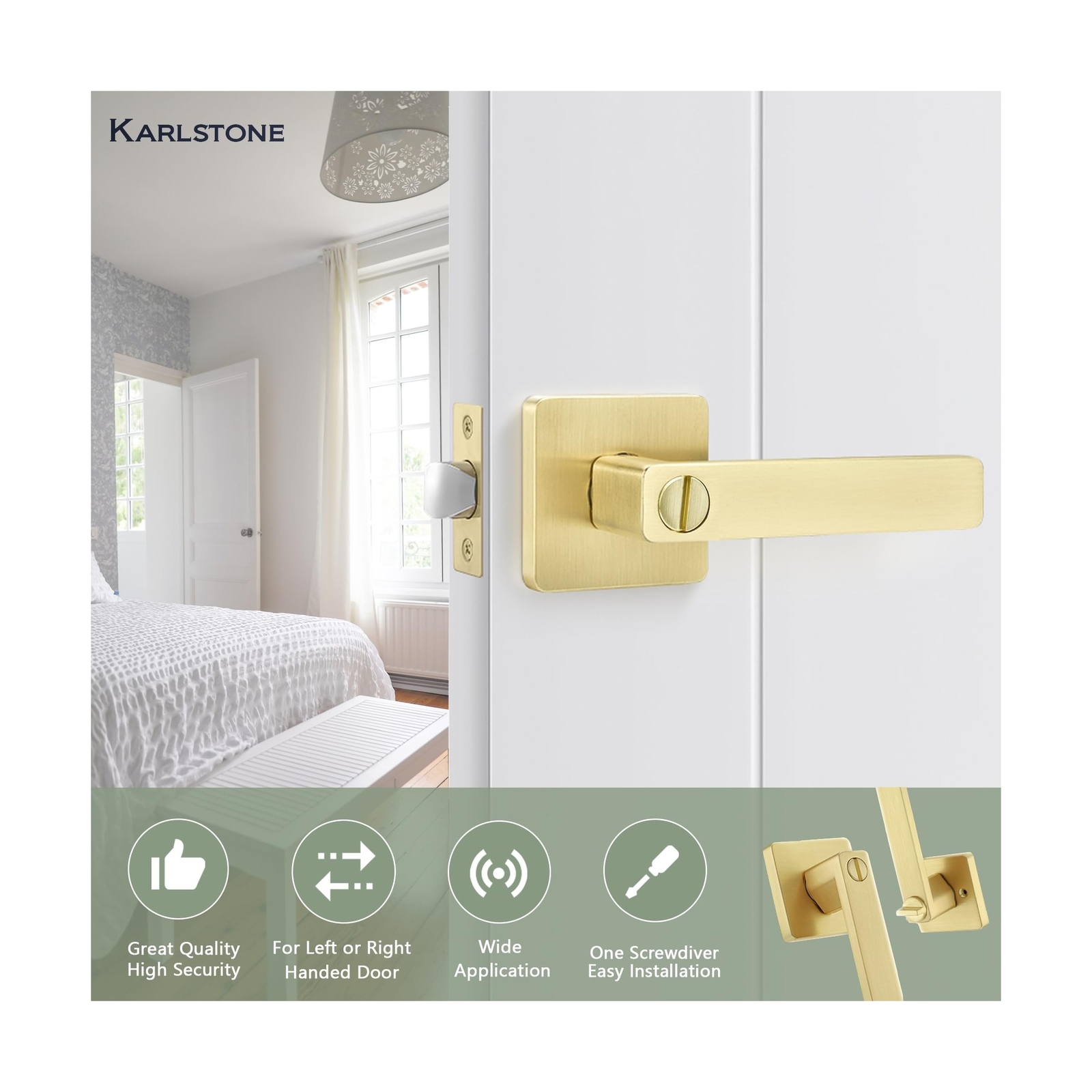 5 Pack Privacy Door Lock,Heavy Duty Gold Lever Door Handle Keyless Modern Interior Door Knob Left or Right Handing Door Handles for Bedroom or Bathroom Product Details Size: 5 Pack Color: Privacy Lock(Keyless) Brand: Karlstone MPN: Does not apply UPC: Does not apply EAN: Does not apply Material: Metal Brand: Karlstone Color: Privacy Lock(Keyless) Product Dimensions: 8"L x 1"W Exterior Finish: Metal Material: Metal Brand: Karlstone Color: Privacy Lock(Keyless) Product Dimensions: 8"L x 1"W Exterior Finish: Metal Special Feature: Anti corrosion, Adjustable Included Components: Exterior Lever, Interior Lever, Latch, Plates, Strikes, Mounting Hardware, Installation Instructions Lock Type: Key Lock Handle Material: Metal Unit Count: 5.0 Count Number of Items: 5 Manufacturer: Karlstone Item Weight: 11.49 pounds Size: 5 Pack Finish: Brass Number Of Pieces: 5 Certification: ANSI Grade 3 Special Features: Anti corrosion, Adjustable Batteries Included?: No Batteries Required?: No Date First Available: June 27, 2023 [Privacy Door Lock] Privacy lock can be locked by the thumb which turns the button on the inside knob,keyless lock set for bedrooms, bathrooms,interior locking doors and other privacy needs.It can be also locked inside and opened outside in emergency WITHOUT keys(use coin or card) [Durable & Modern Design] - Modern square door lever confirm with ANSI Grade 3 Security, Exceeds 200,000 cycle. Uniquely crafted square shaped door lever with heavy duty constructions, made of high quality metal which is wear-resistant and anti-corrosion. [Application] Karlstone handles fit all doors 35mm to 45mm (1-3/8" to 1-3/4") and 60mm to 70mm (2-3/8" to 2-3/4") adjustable latch. Reversible for both left handed and right handed doors. (Notice: The latch plate is unremovable.) [Easy Installation] All you need is a door and a tool set! No need for professional door fitters, you can install them by yourself. The package includes a detailed instruction guide with door hole marking template.No small and fiddly parts,packaged individually to ensure you receive them in perfect condition every time. [After-sales Service]- We respect all the reviews and are dedicated to providing better products and experience. Our goal is to provide the highest quality at the best price and ensure that our customers are always satisfied with our products and service. Any question or problem about the items, please don't hesitate to contact us, we offer 365-day money back for any reason. Payment Back to Top We accept Paypal and All Major Credit Cards. Shipping & Handling Back to Top Item will be shipped FREE standard shipping in 1 business day after payment is received. Express Shipping services are available. Tracking number will be provided. Return Policy Back to Top Items can be returned for exchange or full refund within 30 days from the date you receive your merchandise. Please contact us before starting a return request, so we can resolve any issues and provide free returns if needed. Return shipping is the responsibility of buyer unless the return is a result of our mistake (i.e., your receive the wrong item). Contact Us Back to Top If you have any questions please contact us. We will respond within 1 business day or less.