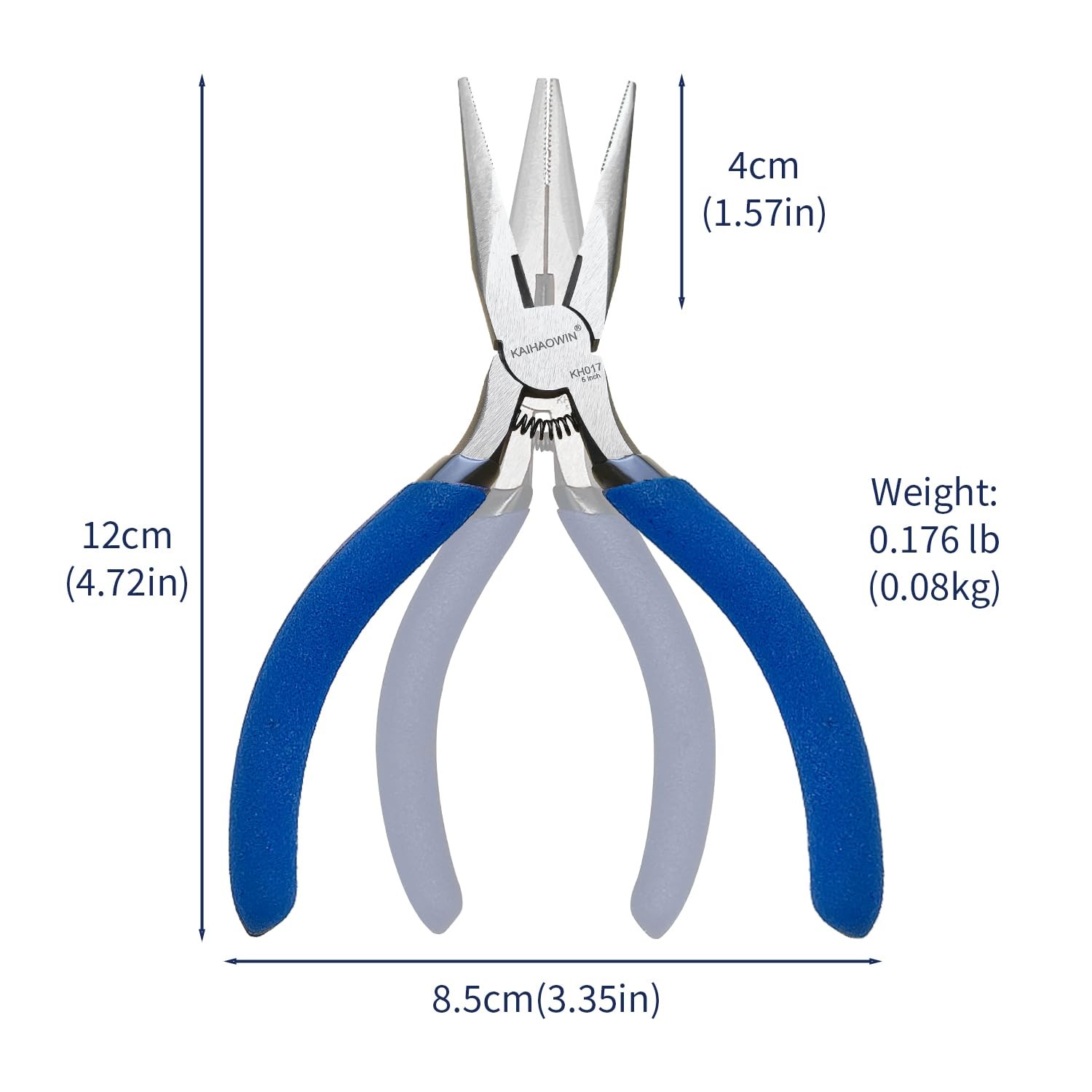 【Product Specifications】This 5 inch needle nose pliers is made of high carbon steel which is rustless. Ultra sharp edge and non-slip tip designs provide high frequency and labor saving working experience. 【Spring Loaded】Spring loaded long nose pliers are more easily to use, and the efficiency of cutting wire is much higher than that of pliers without springs. Save your force when you use this tool. 【Comfortable Handle】The handle is designed with anti-slip rubber which is ergonomically for a good grip in various situations, providing comfort reducing hand fatigue,long time use but not feel tired. 【Mini Needle Pliers】 5 Inch needle-nose pliers can do tiny projects for working in hard to reach areas. Long, tapered nose design is excellent for working in tight places, gripping small object. 【Applications】Mini needle nose pliers for jewelry making, bending wire, small object gripping. The side cutting edge can cut zip tie, wire, guitar strings. Also for computers maintenance, electronics repair, hard to reach area working.
