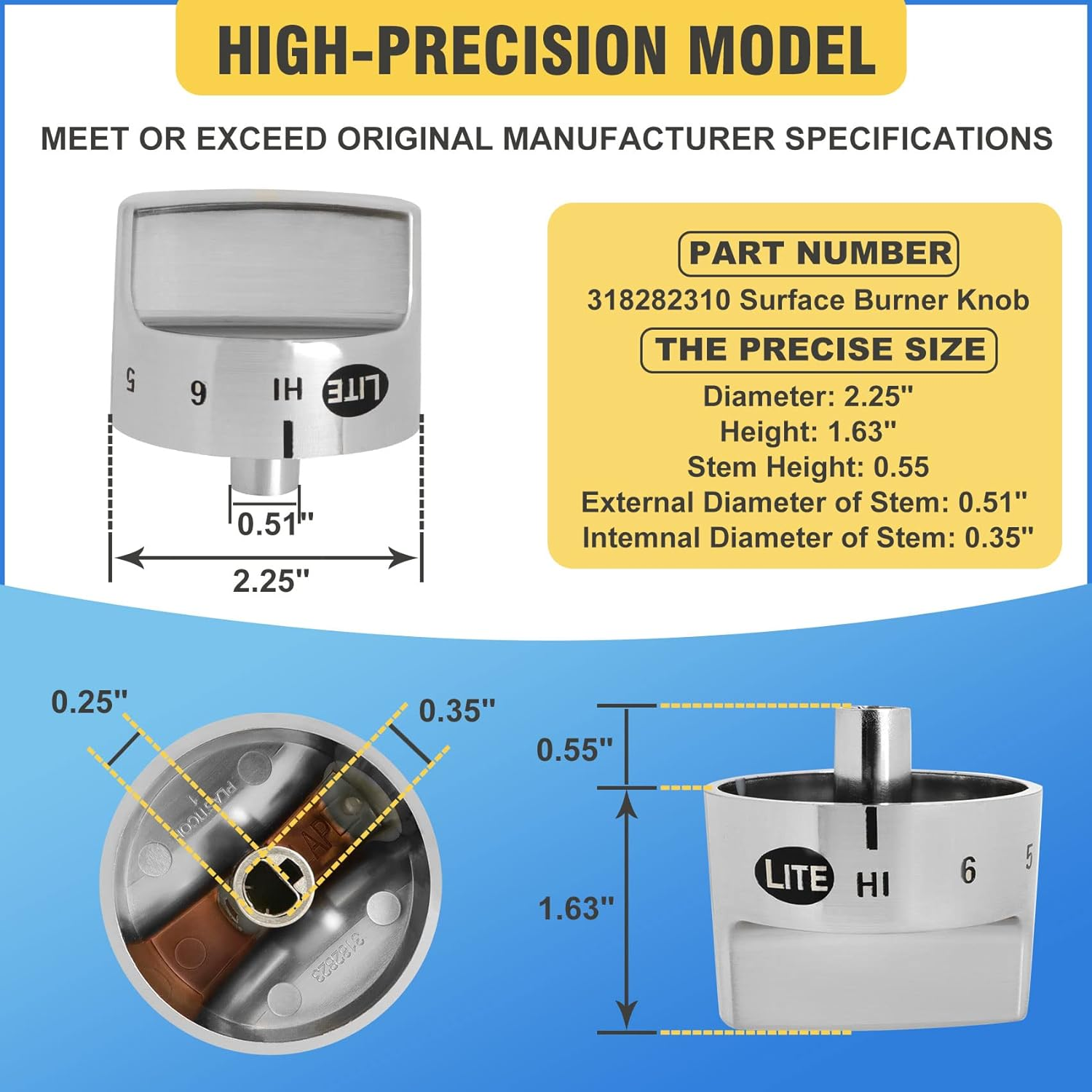 Neighborhood service 5Pcs 318282310 Range Knob Plastic Material Compatible with Gas Cooktop Knob , Elite Gas Range Knob AP3774164, 1062940, AH979119, EA979119, PS979119,PD00025606 ENJOY THE FEATURES 【Applicable Models】Please confirm the model of the knob at the time of purchase. Don't buy the 318282310 range knob just because it looks similar.Applicable models:Our 318282310 range knob replacement part numbers:318282310, ap3774164, 1062940, ah979119, ea979119, ps979119, pd00025606.Compatible with kenmore elite gas range models: 79075403500,79075403501,79075403502 and compatible with kenmore gas cooktop 79033043400,79033043401 【Product Size】This 318282310 range knob is suitable for model"D".The proper size of the D-shape shaft is the focus of purchasing this product.The bottom d-shaped shaft measures 0.35" and the knob length is 0.55".Please make sure that the direction of the d-axis pointing "OFF" is the same as your knob before purchasing 【Easy to install】318282310 range knob is made of the highest quality durable plastic. The surface of the knob 318282310 is coated with a layer of high-quality stainless steel, which is resistant to high temperature, deformation and fracture. Through strict testing, we can ensure lasting and effective performance 【Premium Quality】The 318282310 range knob is made of the highest quality durable plastic .The knob 318282310 surface is plated with a layer of high-quality stainless steel, high temperature resistance, not easy to deformation, not easy to break.After rigorous testing,ensure long-lasting and effective performance 【Comprehensive After-sales Service】: What you have purchased is not just a product, but also our complete after-sales service: you trust me, I will give you a satisfactory experience. If you are not satisfied, we will solve the problems you encounter Product Description Compatible models 318282310 range knob replacement part numbers:318282310, ap3774164, 1062940, ah979119, ea979119, ps979119, pd00025606. Compatible with kenmore elite gas range models: 79075403500,79075403501,79075403502 and compatible with kenmore gas cooktop 79033043400,79033043401. Product Size This 318282310 range knob is suitable for model"D".The proper size of the D-shape shaft is the focus of purchasing this product.The bottom d-shaped shaft measures 0.35" and the knob length is 0.55".Please make sure that the direction of the d-axis pointing "OFF" is the same as your knob before purchasing. 318282310 range knob is made of the highest quality durable plastic. The surface of the knob 318282310 is coated with a layer of high-quality stainless steel, which is resistant to high temperature, deformation and fracture. Through strict testing, we can ensure lasting and effective performance. The 318282310 range knob is made of the highest quality durable plastic .The knob 318282310 surface is plated with a layer of high-quality stainless steel, high temperature resistance, not easy to deformation, not easy to break.After rigorous testing,ensure long-lasting and effective performance. What model is 318282310 knob suitable for? Compatible with kenmore elite gas range models: 79075403500,79075403501,79075403502 and compatible with kenmore gas cooktop 79033043400,79033043401. What is the valve size for knob 318282310? The bottom d-shaped shaft measures 0.35" and the knob length is 0.55".Please make sure that the direction of the d-axis pointing "OFF" is the same as your knob before purchasing. What is the valve size for knob 318282310? 318282310 range knob replacement part numbers:318282310, ap3774164, 1062940, ah979119, ea979119, ps979119, pd00025606. What are the functions of the 318282310 knob? 1. Cracked or damaged oven knob 318282310.2. The oven knob 318282310 does not turn and so on.3. The oven knob 318282310 is missing. What are the after-sales services for 318282310 knob? You can take it home and try it out first.If it doesn't work,please feel free to contact.We will reply to you within 24 hours. Item model number 318282310 Number of Items 5 Country of Origin China Batteries Included? No Unit Count 5 Count Batteries Required? No Special Feature Easy to Install Material Stainless Steel, Plastic Package Type FFP Shape Round Finish Type Plated Metal Type Stainless Steel Material Type Stainless Steel, Plastic Item Weight 5 ounces Lock Type Slide Special Features Easy to Install Exterior Finish Stainless Steel Part Number 318282310 Model Info 318282310 Handle Material Stainless Steel Style Compatible,Simple Handle Type Knob Included Components Knob Product Dimensions 1"L x 1"W 1.0 "w x 1.0 "w. Weight: 5.0 oz PAYMENT We accept all payments via Ebay using Credit Cards , PAYPAL , Apple Pay and many others SHIPPING We are always working hard to ensure your package arrives as soon as possible. Please understand that some factors like weather, high postal traffic, and the performance of shipping companies are outside of our control. We offer free shipping to the lower 48 states and ship within 3-5 business days of payment, usually sooner. We do not accept P.O. Boxes. Please provide a physical address. We do not ship internationally at this time. DELIVERY & RETURN POLICY We do not offer returns unless the item violates eBay policies. Please be aware these polices only make sellers accept returns if the item violates eBay's Buyer Guarantee. If you would like to learn more about this please visit eBay's Help Page. Thank you for your business