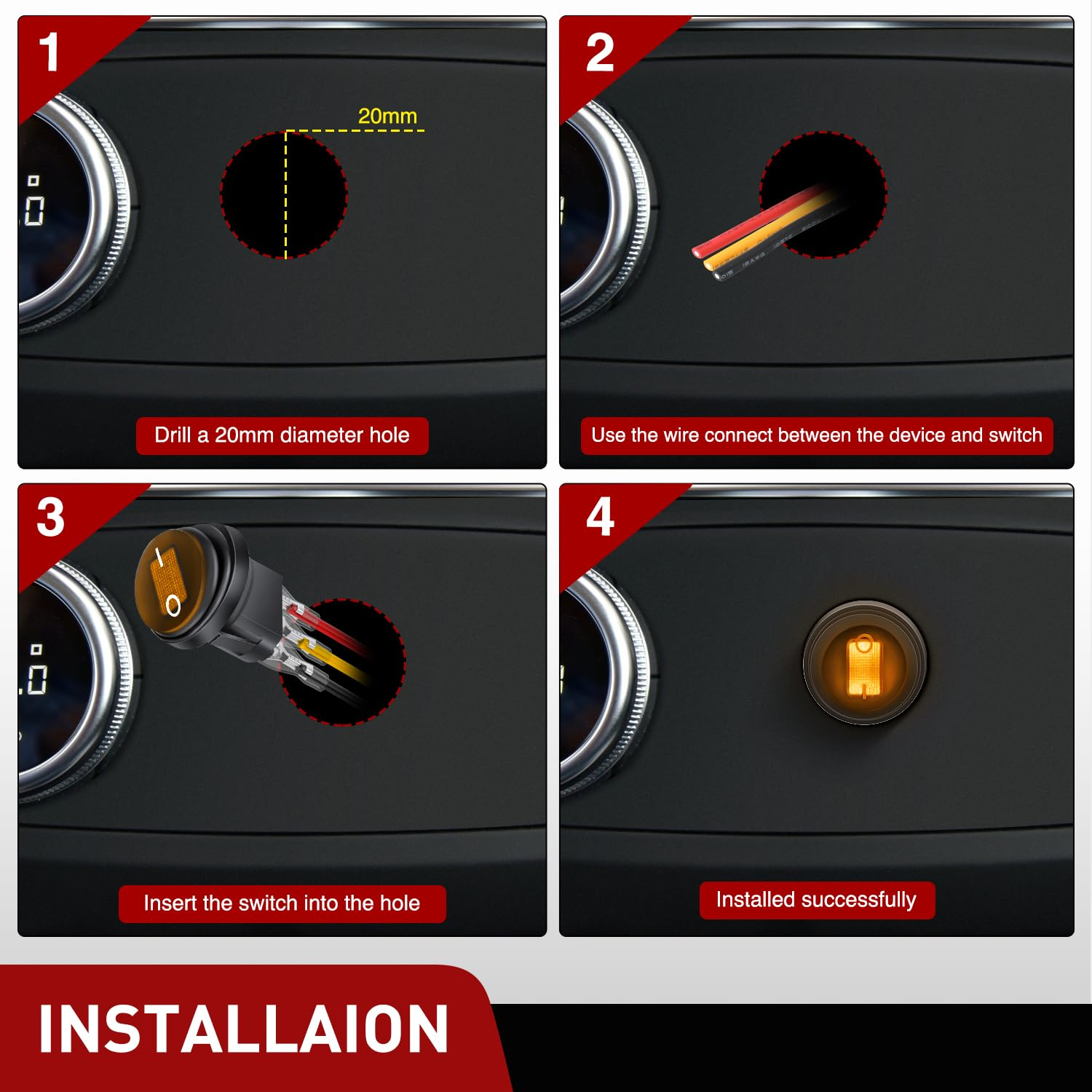 LED Indicator Light: This round toggle switch comes with 12 volt Yellow LED light, so when you turn the rocker switch 12V on, the LED light also lights up at the same time, which could indicates the working status of the device Snap-in Design:The round switch adopts a snap-in design for easy installation,and it have 3 terminals :silver plated brass,longer service life Waterproof: With a rubber cover can be safely used in moist environment, IP65 waterproof performance, so that it can be widely applied to marine, boats, ships, automotive, cars, RVs, trucks, off road vehicles, ATVs, and any others that use a 12V power source Material: The round rocker switches are made of high-quality plastic and good brass conductive pins, The switch has passed our quality inspection. Switching Life: 50000 times Application:This round led rocker switch rated at 12V 20A, which can hold most types of circuits, suitable for Car,Truck, Marine boat, UTVs, ATVs etc Product Description Nilight 12V Yellow LED Round Waterproof Rocker Switch 12V LED Round Waterproof Rocker Switch Specification Polarity: SPST; Type: 3 PINS with Yellow LED; Switch Operation: ON/OFF Switch Rating: 12VDC Hole Diameter:20mm/0.8’’ Material: Plastic, Metal Package includes: 5 Pcs Toggle Swithes with Jumper Wires Features ON-OFF LED Round Switch SPST 3 Prong ON-OFF lighted round rocker switch with 20A 12VDC Rating. LED Indicatior will light up when is turned ON. IP65 Waterproof Rating This waterproof switch can be used in a wet environment, no worry about rain or water anymore, which can be used outdoor and rainy day. Snap-in Design Snap in Design make the switch easy to install. Extruding the plastic part, then Push in to the Panel. Silver-plated Terminals Thickened silver-plated terminals make the switch operate stably under 20A 12VDC. Easy Installation Step 1 Drill a 20mm diameter hole. Step 2 Use the wire connect between the device and switch. Step 3 Insert the switch into the hole. Step 4 Installed successfully. 1 Low Amp Circuit Diagram 2 High Amp Circuit Diagram Wide Application Greatly suitable for most DC 12V-24V cars, UTV/ATV, trucks, trailer, RV, caravan, bus, marine boat, yacht, airplane, etc. Related Prouducts Add to Cart Add to Cart Add to Cart Add to Cart Add to Cart Add to Cart Add to Cart Customer Reviews 4.6 out of 5 stars 549 4.6 out of 5 stars 1,226 4.6 out of 5 stars 4,149 4.6 out of 5 stars 1,226 4.6 out of 5 stars 4,149 4.6 out of 5 stars 1,226 4.6 out of 5 stars 1,226 Price $12.09 $ 12 . 09 $20.25 $ 20 . 25 $8.09 $ 8 . 09 $8.99 $ 8 . 99 $8.09 $ 8 . 09 $10.37 $ 10 . 37 $7.93 $ 7 . 93 Switch Type ON-OFF ON-OFF ON-OFF (ON)-OFF ON-OFF ON-OFF ON-OFF Rated Current 20A 12V DC 5A 12-24V DC 20A 12V DC 2A 12V DC /5A 24VDC 20A 12V DC 20A 12V DC 20A 12V DC Mounting Hole Size 20mm 16mm 20mm 16mm 28.8mm 12mm 20mm Jumper Wires ✔ ✔ ✔ ✔ ✔ ✔ ✔ Rating 12V DC 12-24V DC 12V DC 12-24V DC 12V DC 12V DC 12V DC