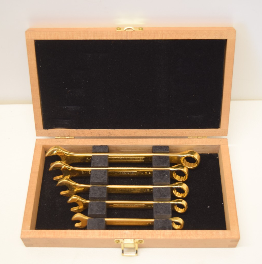 Best Pricing High Quality Fast Shipping Napa 61551 5pc 14 Karat Gold Plated Mirror Finish Wrench Set w/Box &Velvet Case Napa 61551 5pc 14 Karat Gold Plated Mirror Finish Wrench Set w/Box & Velvet Case. Each wrench has some marks, scuffs and scratches on them, but none of them appear to have ever actually been used for any work, the marks and scratches appear to be more from them just sitting in the case and box and getting moved around. Each wrench is still in overall good cosmetic condition. Comes as pictured in original velvet lined wooden box. There are no previous owner markings or engravings on any of the wrenches. Sizes Included: 3/8" - NDR50 7/16" - NDR52 1/2" - NDR54 9/16" - NDR56 5/8" - NDR58 Payment Shipping All Orders Ship Within 72 Hours of Payment All Orders Ship Using USPS/FEDEX/UPS If you have any shipping requests, please contact us prior to payment Returns We offer 30-Day cash back on most of of items for sale. Any item being sold AS-IS will be clearly stated in the listing. Customer satisfaction is Twin Cities Pawn main goal. If you have a issue with your purchase please send us a direct message on eBay before leaving a negative review. We are always willing to work with our customers to make sure they're happy with the item they purchased. Thank you Best Pricing High Quality Fast Shipping Napa 61551 5pc 14 Karat Gold Plated Mirror Finish Wrench Set w/Box & Velvet Case. Each wrench has some marks, scuffs and scratches on them, but none of them appear to have ever actually been used for any work, the marks and scratches appear to be more from them just sitting in the case and box and getting moved around. Each wrench is still in overall good cosmetic condition. Comes as pictured in original velvet lined wooden box. There are no previous owner markings or engravings on any of the wrenches. Sizes Included: ---3/8" - NDR50 ---7/16" - NDR52 ---1/2" - NDR54 ---9/16" - NDR56 ---5/8" - NDR58 Napa 61551 5pc 14 Karat Gold Plated Mirror Finish Wrench Set w/Box &Velvet Case Napa 61551 5pc 14 Karat Gold Plated Mirror Finish Wrench Set w/Box & Velvet Case. Each wrench has some marks, scuffs and scratches on them, but none of them appear to have ever actually been used for any work, the marks and scratches appear to be more from them just sitting in the case and box and getting moved around. Each wrench is still in overall good cosmetic condition. Comes as pictured in original velvet lined wooden box. There are no previous owner markings or engravings on any of the wrenches. Sizes Included: 3/8" - NDR50 7/16" - NDR52 1/2" - NDR54 9/16" - NDR56 5/8" - NDR58 Payment Shipping All Orders Ship Within 72 Hours of Payment All Orders Ship Using USPS/FEDEX/UPS If you have any shipping requests, please contact us prior to payment Returns We offer 30-Day cash back on most of of items for sale. Any item being sold AS-IS will be clearly stated in the listing. Customer satisfaction is Twin Cities Pawn main goal. If you have a issue with your purchase please send us a direct message on eBay before leaving a negative review. We are always willing to work with our customers to make sure they're happy with the item they purchased. Thank you Best Pricing High Quality Fast Shipping Napa 61551 5pc 14 Karat Gold Plated Mirror Finish Wrench Set w/Box & Velvet Case. Each wrench has some marks, scuffs and scratches on them, but none of them appear to have ever actually been used for any work, the marks and scratches appear to be more from them just sitting in the case and box and getting moved around. Each wrench is still in overall good cosmetic condition. Comes as pictured in original velvet lined wooden box. There are no previous owner markings or engravings on any of the wrenches. Sizes Included: 3/8" - NDR50 7/16" - NDR52 1/2" - NDR54 9/16" - NDR56 5/8" - NDR58