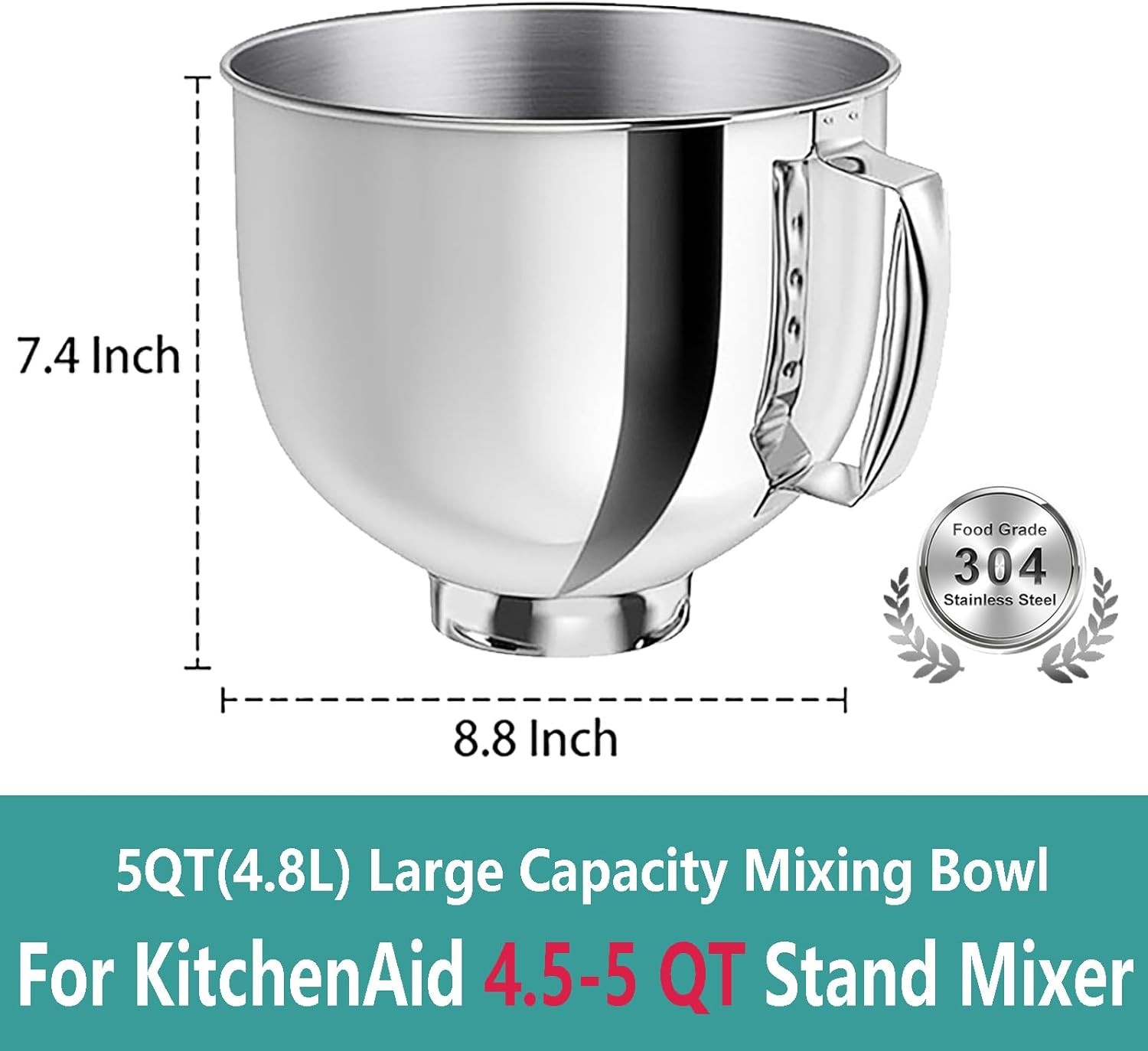 🥣【Applicable Models】 mixing bowl for kitchenaid mixer are not only compatible with popular models such as K45,K45SS,KSM150PS,KSM150PSBK, but also with KSM75, KSM90, KSM95, KSM100, KSM103, KSM110 etc. and for most from 4.5QT to 5QT Artisan & Classic(Plus) Series Tilt-Head Mixers.(Not Fit Bowl Lift and Artisan Mini Series!) 🥣【Durable and Functional Design】 Crafted from premium food-grade 304 stainless steel, this 5QT stainless steel replacement bowl for kitchenaid withstands daily heavy-duty use. A durable mixer bowl designed for tilt-head stand mixers, perfect as an essential mixer accessory. 🥣【Ample Mixing Capacity】 With a 5-quart capacity, this large stainless steel mixing bowl handles big batches of dough and batter without spills. Ideal for both beginners and professionals seeking high-capacity mixing bowls for kitchenaid stand mixers. 🥣【Comfortable Handle for Easy Use】 Designed with a comfortable and ergonomic handle design, this bowl for kitchenaid tilt-head mixers is easy to attach and carry, providing a seamless experience while using your kitchenaid mixer. Say goodbye to struggles with cumbersome bowls and enjoy effortless mixing! 🥣【Scratch-Resistant & Easy to Clean】 The polished stainless steel finish not only enhances the aesthetic appeal but also provides a scratch-resistant surface, ensuring that your kitchenaid accessories and attachments remain in pristine condition. Cleaning is a breeze, allowing you more time to focus on baking. 🥣【Perfect Match for KitchenAid Tilt-Head Mixers】 Specifically designed for KitchenAid Tilt-Head Stand Mixers, this 5QT mixing bowl is the perfect addition to your collection of kitchenaid mixer accessories, helping you create delicious treats effortlessly and elevating your baking experience.