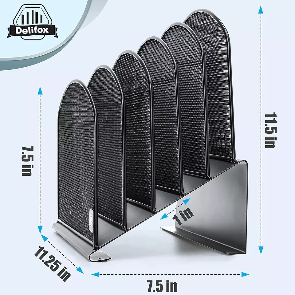 ▶NO ASSEMBLY REQUIRED. Dimension: 11.25"W x 7.5"D x 11.25"H ▶ SUFFICIENT SPACE FOR STORAGE. Delifox 5-compartment desktop file organizer is large enough to hold and classify many document or papers so as to eliminate worry of document run-off and keep track of files, folders, and other important papers ▶ REINFORCED & STAND-UP DESIGN. This file organizer for desk featuring deep groove ensures stable and heavy-duty use. And heightened triangle base and vertical file holder featuring standing-up design offers easy access to all documents ▶ PERFECT FOR HOME SCHOOL OR OFFICE. This incline file sorter for desk is ideal for storing file folders, document, papers, notebooks, etc, perfect solution for office, school classroom organization, and home storage ▶ THE HEAVY DUTY DESIGN. The vertical desktop file folder holder organizer is made of high-quality metal, which can guarantee enough durability and consumer satisfaction