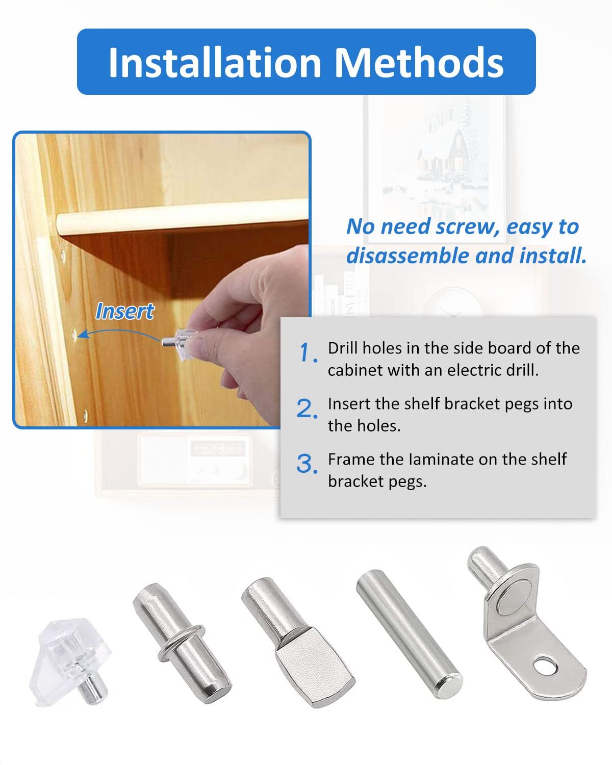 These shelf pegs are a game-changer! The nickel-plated finish looks sleek, and the five different styles provide great versatility. They fit perfectly in standard 5mm and 1/4" holes, holding shelves securely without wobbling. With 102 pieces, I had plenty for multiple projects—bookshelves, cabinets, and closets. Sturdy, easy to install, and great value for the price. Highly recommend for anyone needing reliable shelf support!