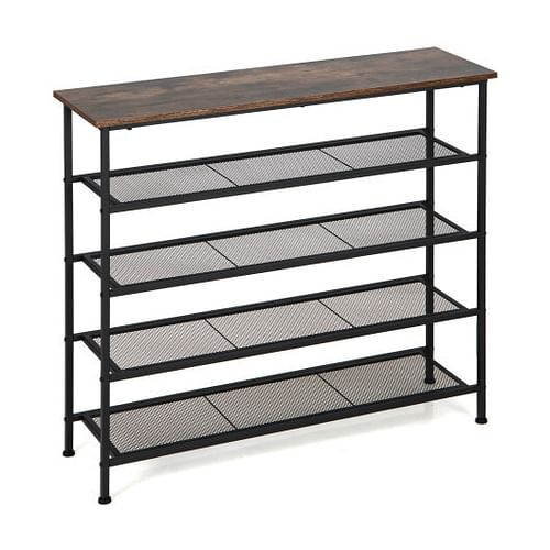 Specifications: Color: Rustic brown Material: Particle board + steel Product dimension: 39.5” x 12” x 36.5” (L x W x H) Net weight: 25.5 lbs Weight capacity of tabletop: 25 lbs Weight capacity of shoe shelves: 15 lbs Package includes: 1 x Shoe rack 1 x Instruction Made of thickened steel tubes and premium wooden tabletop the shoe rack has a good weight capacity to hold your shoes and items. And the adjustable feet design can keep it stable even on the uneven ground which can also protect your floor from scratches. Besides this shoe rack has 5 tiers to organize your items in order and save your space which can also be used as a storage shelf book rack or organizer in your bedroom kitchen living room or entryway. Meanwhile the industrial outlook can add a unique touch to your room. If you are looking for a shoe rack like this do not miss it! If you are looking for this product don't hesitate to place an order! Open shelf design for easy access Easy assembly with detailed instruction Sturdy steel frame structure ensures durability Smooth and wear-resistant surface for easy cleaning Ideal for living room bedroom entryway study etc Adjustable feet can fit uneven ground and keep stable Wide tabletop and 4 tier shelves offers ample storing space Can be used as a shoe rack office storage shelf book rack