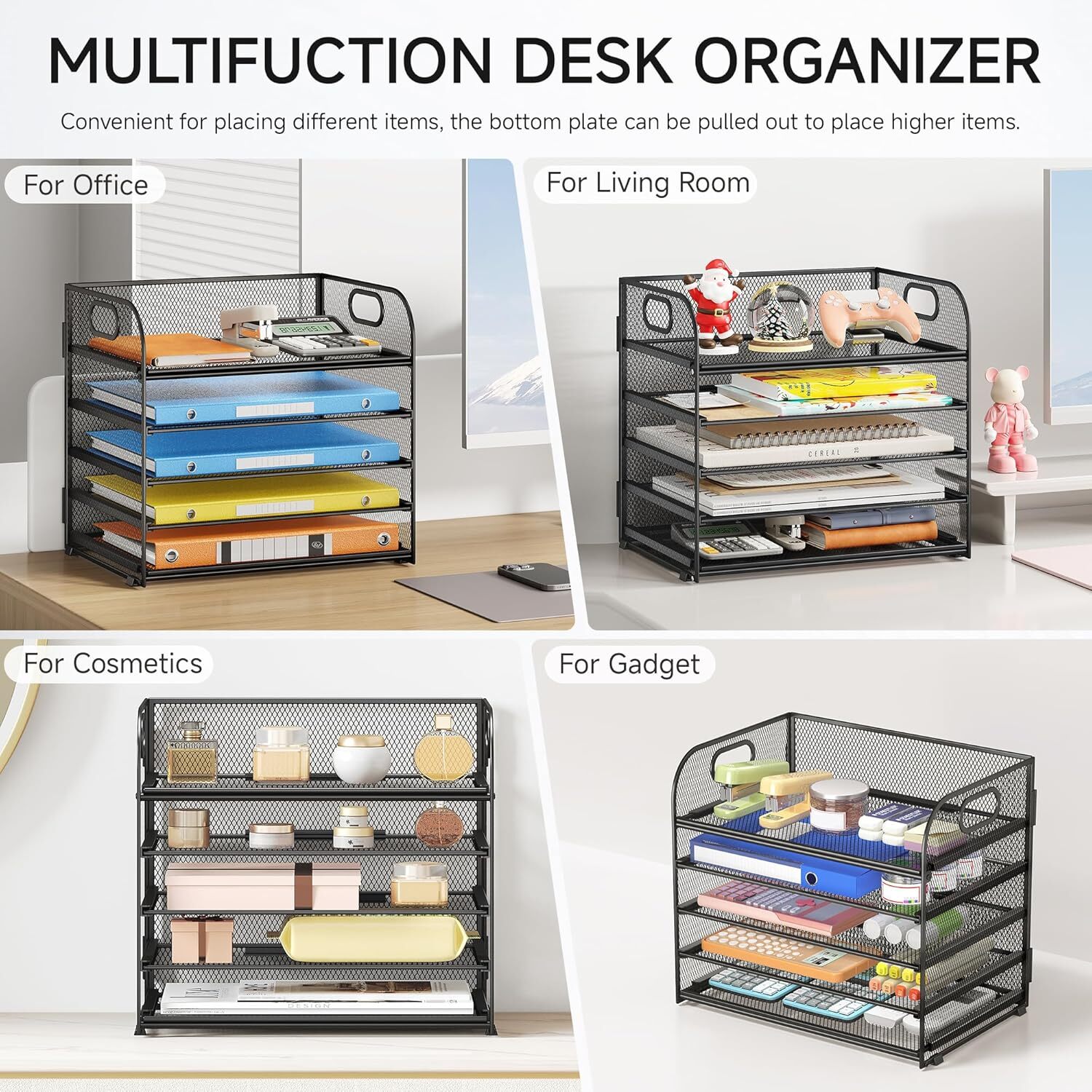5 Tray Desk File Organizer, Mesh Paper 13.4" x 12.6" x 9.1", 5 Tier - Black Product Details Brand: Lavatino Color: 5 Tier - Black Material: Metal Product Dimensions: 13.4"L x 12.6"W x 9.1"H Shape: Rectangular Tray Type: Metal Special Feature: Lightweight Style: black 5C-01 Finish Type: Powder Coated Recommended Uses For Product: Books Number of Items: 1 Occasion: Wedding, Anniversary, Birthday Product Care Instructions: Wipe with Dry Cloth Pattern: Solid Theme: Rainbow Is Oven Safe: Yes Maximum Weight Recommendation: 30 Pounds Is Dishwasher Safe: No Manufacturer: Lavatino Item Weight: 4.07 pounds Item model number: Desk File Organizer with Handle 5C-01 Material Type: Metal Number of Shelves: 5 Size: 13.4" x 12.6" x 9.1" Manufacturer Part Number: Desk File Organizer with Handle 5C-01 Brand: Lavatino Color: 5 Tier - Black Material: Metal Product Dimensions: 13.4"L x 12.6"W x 9.1"H Shape: Rectangular 【Upgraded Desk Organizer】The humanized office organization owns 5 sliding trays and 2 Protable Handles which tidies up your desktop and is convenient to your office! All the designs specialized to comply with your office, such a perfect supplies desk organizer must be the best choice for your office accessories! 【Multifunction Organization】The paper tray organizer is very suitable for storing books, magazines, letters, and A4 paper. The file organizer and hanging pen holder enough accommodate all office supply accessories, such as pens, pencils, scissors, and so on. Perfect Size: 13.4*12.6*9.1inch. 【Easy To Assemble】The installation of the office supplies organizer can be completed in 12 minutes follow the instruction book, super easy to assemble don't worry about any questions about that! 【Premium Material】The desk organizers and accessories is made of lightweight durable metal mesh and reinforced with a solid steel frame that makes it have long-lasting strength and reliable performance. 【Risk-Free Purchase】Our store regard customer satisfaction as our biggest motivation. So, if there is any problem with our product, please be free to contact us, we would offer a 90-day return policy! there is no risk at all, please do not hesitate to order soon!
