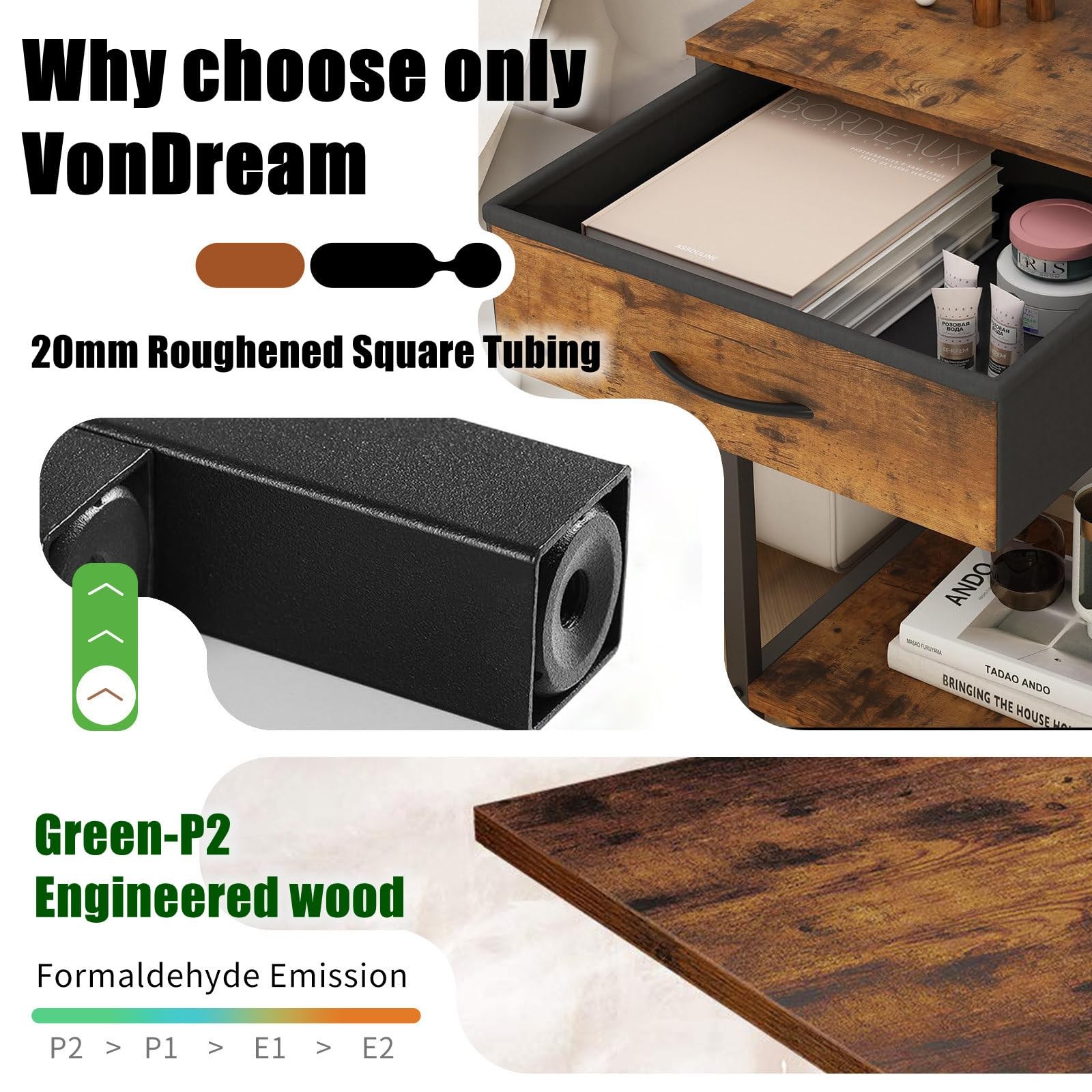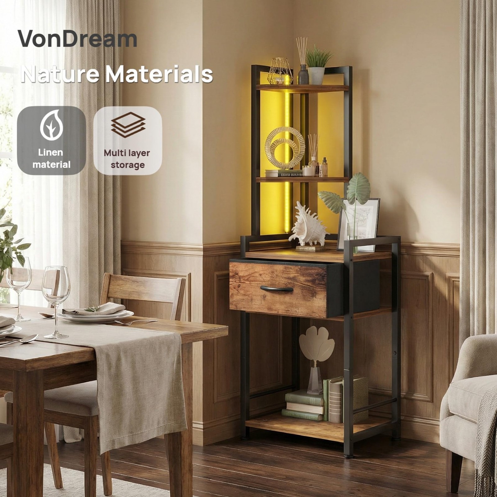 【5 Tier Large Capacity Storage But Saves Space】3 tier storage shelves and 2 tier small shelves form a 5 tier corner shelf. Can be used as a bookshelf or display shelf. Can organize a lot of small items 【Suitable for Many Occasions】This corner shelf is beautifully designed and sturdy. Suitable for use in living room, bedroom, kitchen, office and more. Suitable for different styles of decoration 【Sturdy Structure and Strong Load-bearing Capacity】The corner stand made of Sturdy board & sturdy metal frame that ensures stability and durability. It is tough enough to hold heavy duty goods like kitchenware, small aquarium 【Easy to Assemble】We have adapted the assembly instructions so that even students can complete the assembly in a short time by reading the assembly instructions 【Excellent Service】 If you encounter any questions about the product after purchasing, you can contact us by email. We will provide you with excellent service Multi-Functional Corner Storage Solution - Maximize vertical space with this 4-tier corner shelf featuring integrated LED lights and a removable fabric drawer, perfect for displaying décor, books, plants, or organizing essentials while illuminating your space. Ambient LED Lighting & Adjustable Brightness - Energy-efficient LED strips with 3 dimmable modes (warm/white/combined) create cozy atmospheres for bedrooms or functional task lighting in home offices. Premium Fabric Drawer & Rustic Aesthetic - Durable linen-style drawer conceals clutter (remote controls, chargers, etc.) while the distressed rustic brown finish blends seamlessly with farmhouse, industrial, or modern interiors. Sturdy Metal Frame & Effortless Assembly - Heavy-duty iron construction supports up to 15 lbs per shelf; tool-free snap-together design allows quick installation in any unused corner. Versatile Corner Cabinet Alternative - Compact freestanding design replaces bulky corner cabinets, ideal for apartments/dorms; use in bathrooms (non-wet areas), kitchens, entryways, or behind doors.