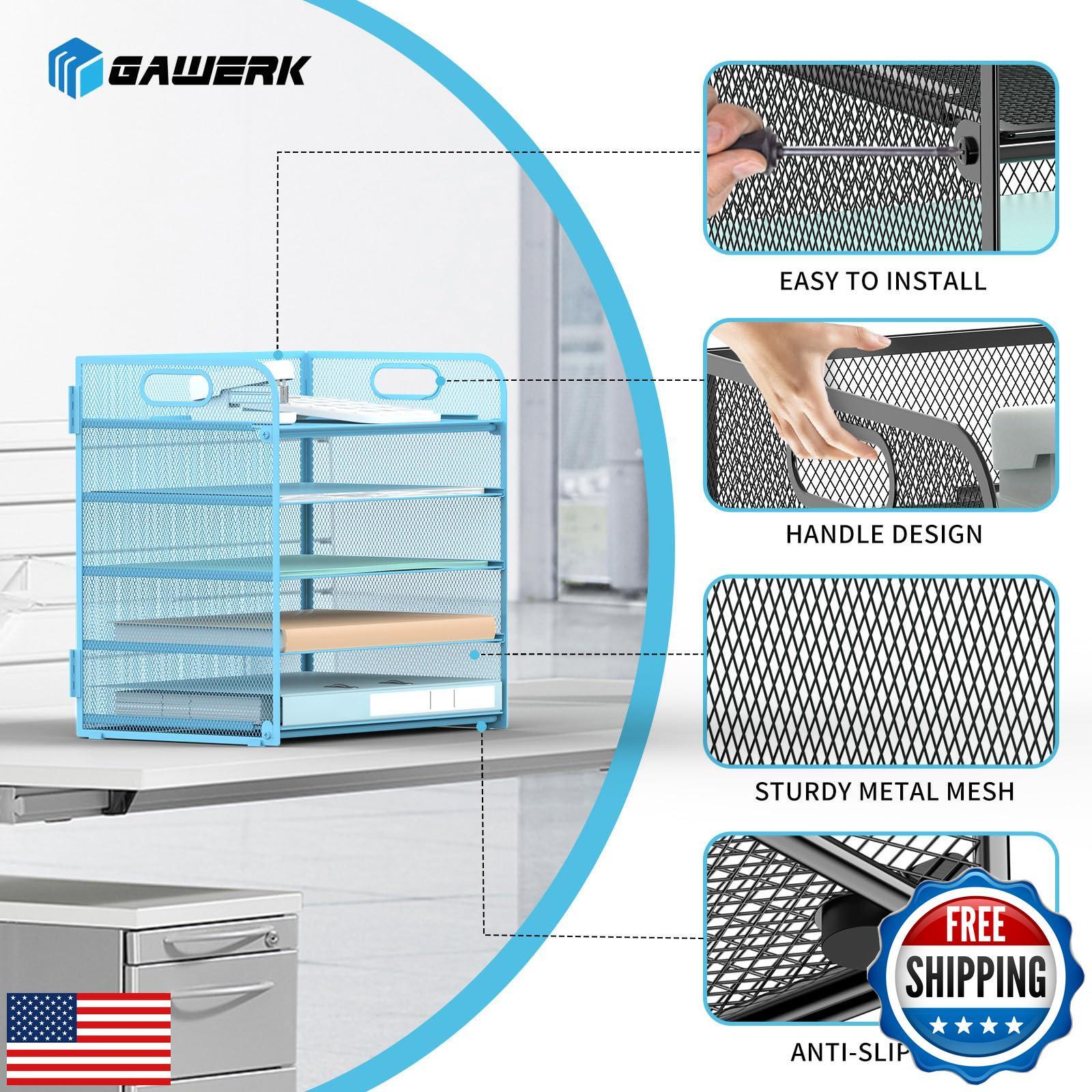 Gawerk 5 Tier Letter Tray Paper Organizer, Mesh Deak File Organizer with Handle for Office School, Blue Features ✏️ Handle Design: The portable handle design which makes the paper tray organizer easy to move and place where you need it! ✏️ Large Capacity: The 5-tier desktop file organizer is perfectly sized to maximize space without sacrificing functionality. ✏️ Easy to Assemble: The office organizer can be easily installed without screws and other tools. The entire installation process can be completed within minutes. ✏️ Multipurpose Use: This versatile design allows this desk file organizer rack to hold magazines, documents, catalogs, newspapers, and much more. ✏️ Durable Material: Our desk organizer is made of sturdy metal mesh, welded very firmly and equipped with rubber anti-slip pads to prevent sliding and avoid surface scratches. Shipping Free & Fast Shipping: We offer free shipping to most of the USA with a normal delivery time of 3-7 days. However, due to the current situation, additional delivery time (up to 3 weeks) may be required for some items. Alternative Carriers: We may use alternative carriers (e.g., USPS, FedEx, UPS) to ensure your package arrives safely and on time. Due to the use of multiple carriers, we are unable to provide a tracking number automatically. Handling Time: Orders are processed and shipped within 1-2 business days of receiving cleared payment. Shipping Restrictions: Shipping to Alaska, Hawaii, Puerto Rico, Guam, and other US territories may incur shipping charges or delivery restrictions. Please contact us before ordering, or your order can be refunded/cancelled. State Restrictions: Certain items may not be shipped to California due to state regulations. Contact for Tracking Updates: If you require tracking updates or have any concerns about the delivery of your order, please feel free to contact us, and we will be happy to assist you. Return Policy 30-Day Hassle-Free Returns: If you are not completely satisfied with your purchase, you can return the item for free within 30 days of receiving it for a full refund or exchange. Easy Return Process: Contact us, and we will provide you with a prepaid return shipping label and detailed instructions. No Restocking Fee: There are no restocking fees for returns. However, the buyer is responsible for return shipping costs if the return is not due to a seller's error. Refund Processing: Refunds will be processed within 1 business day of receiving the returned item in its original condition. Payment We accept all major credit cards, PayPal, and Apple Pay for your convenience. Your payment information is secure and encrypted to ensure a safe and seamless transaction. Please complete your payment within 3 days of purchase to avoid any delays in shipping. Feedback Your feedback is extremely important to us. We strive to provide the best products and customer service possible. If you are satisfied with your purchase, please take a moment to leave us a positive review. If you have any concerns or issues with your order, please contact us before leaving negative feedback. We are committed to resolving any problems and ensuring your satisfaction. Contact Us If you have any questions or concerns, please feel free to reach out to our customer support team. You can contact us through the eBay messaging system. We are available Monday to Friday, 9:00 am to 5:00 pm EST, and we will do our best to respond to your inquiry within 24 hours. Thank you for supporting our small family business!