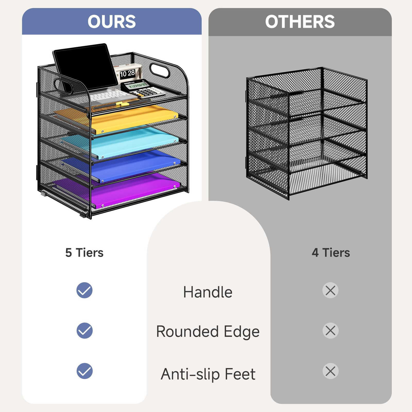 【EFFICIENT DESK ORGANIZER】Keep your desk tidy and clutter-free with our 5-Tier Paper Organizer with Handle. This file organizer provides ample space for sorting and storing papers, letters, documents, folders, books, magzines, staplers, caculators and sticky notes. 【USER-FRIENDLY DESIGN】You could lift this file organizer easily with smooth handles. One corner of the desktop organizer is designed with a rounded edge for safety. Additionally, each folder organizer comes with anti-slip feet to keep stable when placing or picking up documents. 【DURABLE CONSTRUCTION】This desk file organizer is crafted from premium metal mesh. Thickened support rods and a sturdy frame ensure that the file organizer won't warp or break when holding a large volume of paper or letters. 【2 STEPS TO ASSEMBLE】The frame of the letter tray is connected by hinges. You only need to fix the top and bottom trays, and then place the middle trays in position. Each letter tray comes with a screwdriver and an installation instruction. It just takes minutes to assemble the document organizer. 【STYLISH OFFICE SUPPLIES】This paper tray is available in multiple colors to match different office styles. Not only the desk organizer tray save space for your workspace, but its stylish design makes your office look more professional. 【100% CUSTOMER SATISFACTION GUARANTEED】Cawukege is committed to helping buyers organize their desktops more easily and effectively. If you have any questions, please feel free to contact us. We will respond within 8 hours and resolve your issue within 24 hours.