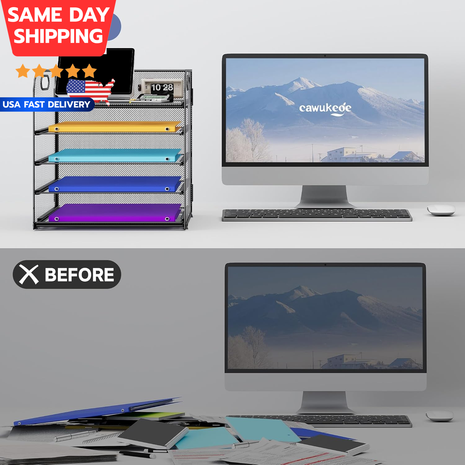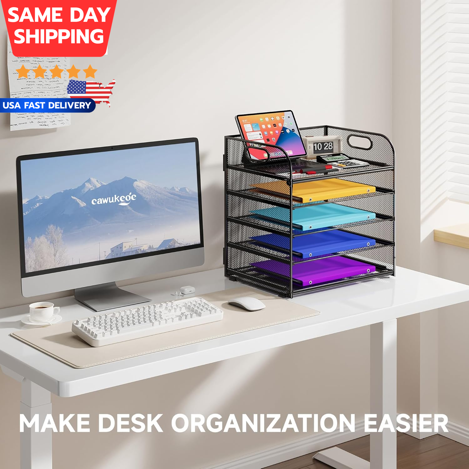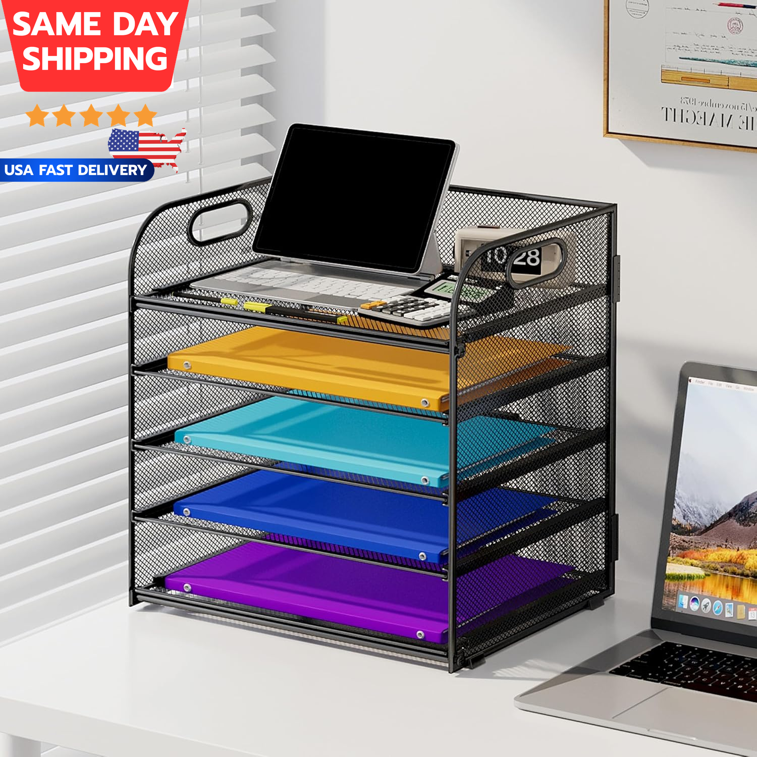 This 5-tier metal mesh organizer is a game-changer for keeping my desk clutter-free! The sturdy black design looks sleek, and the handy handle makes it easy to move around. I love how it neatly stores papers, folders, and even small office supplies—perfect for my home office setup. The anti-slip feet keep it stable, and the spacious tiers hold everything without bending. Super functional and stylish!