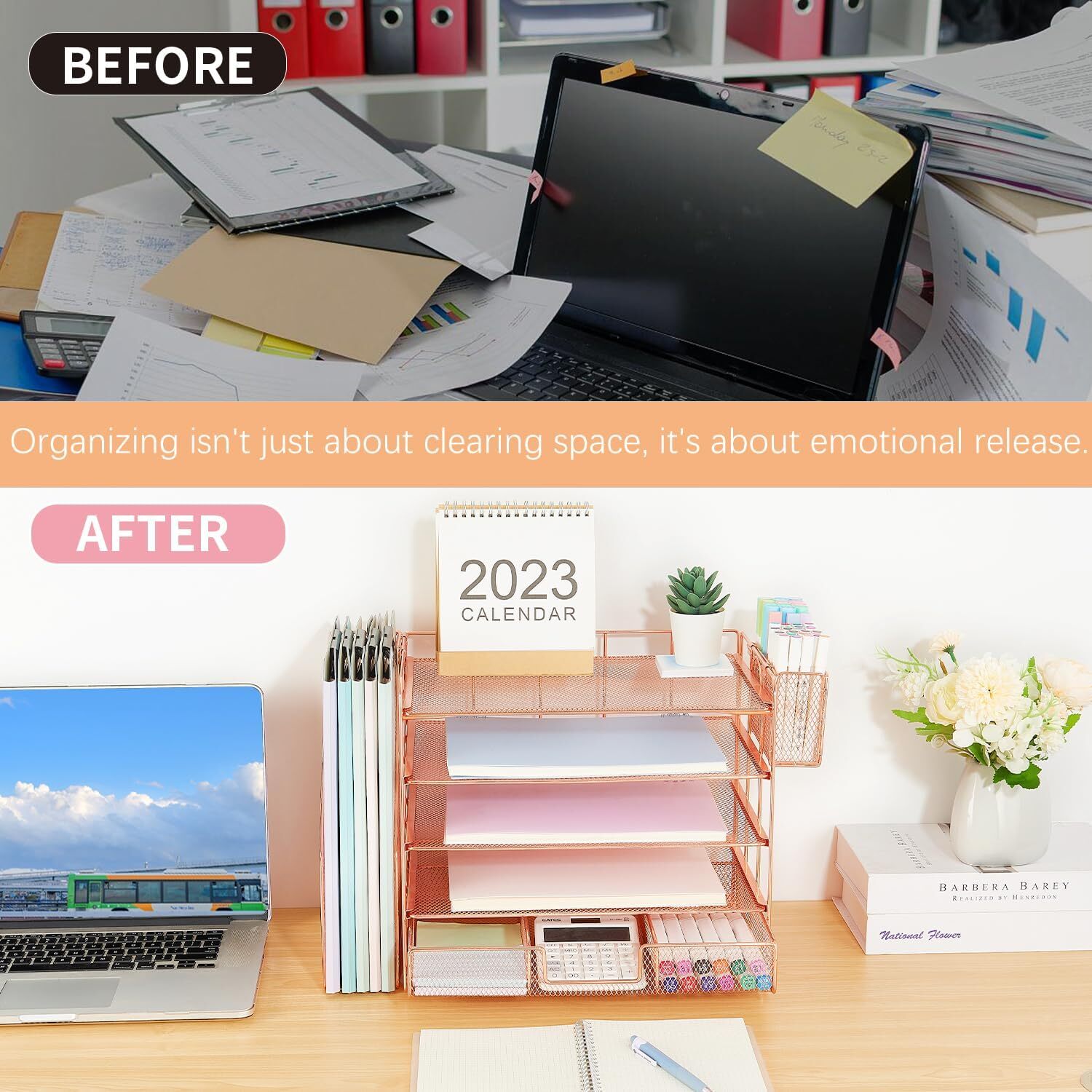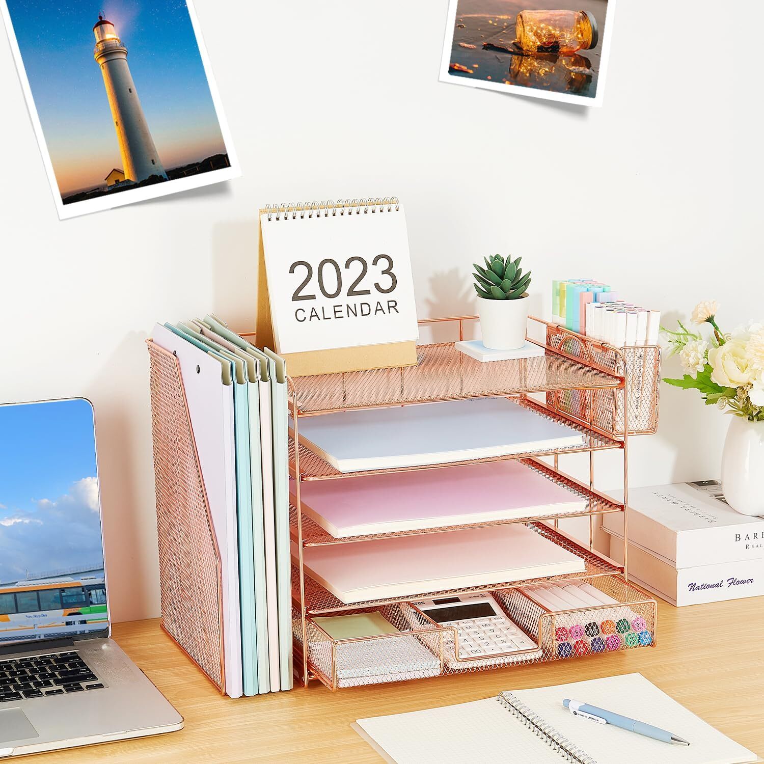 Desk Organizer, 5-tier Paper Letter Tray Organizer with File Holder Rose Gold Product Details Specific Uses For Product: Office Supplies, Stationery Material: Metal Special Feature: Foldable Color: Rose Gold Brand: Gugsey Finish Type: Plating Product Dimensions: 16"D x 11.8"W x 8.6"H Shape: Rectangular Unit Count: 1.0 Count Package Type: FFP Mounting TypeNumber of Compartments: Tabletop Mount5 【Worry-free shopping】We understand the troubles and concerns that may arise during shopping, if there are any problems with the desk organizer 【Save Space】The Gugsey Desk File Organizer has 5-tier paper letter tray + vertical file holder + hanging pen holder + sliding drawer, which is enough to accommodate all office supplies and office desk accessories. Office organization are designed to help you keep your desk tidy and clean, reduce work anxiety and increase happiness. 【Practical Functions】With the desk organization 5-tier sliding tray, you can easily sort and organize your files and items in each compartment. It comes with a pen holder so you can keep all your pens, pencils, and markers organized and within easy reach. The drawer provides additional storage space for smaller office accessories or school supplies like sticky notes, and paper clips. 【High-quality Materials】The desk organizers and accessories is made of metal material, which ensures the stability and durability of the product and can be used for a long time, providing you with a stable file storage solution. At the same time, the smooth surface and rounded edges ensure safe use and will not damage your documents or scratch your desktop. 【Office Decor】The Gugsey Desktop Organizer not only keeps your workspace organized but also adds a touch of sophistication and elegance to your desktop. It complements any style and showcases your professional, clean work style.