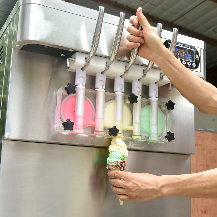 Kolice Commercial heavy duty floor stand 5 flavors soft ice cream machine,3+2 mixed flavors, ETL certificate, 110V 60HZ, 2000W , US plug, 4.3” touch control panel, non slip foot design, new design model,full transparent dispensers, you can make clear of the ice cream making status, greater expansion rate to makes the ice cream more smoother and softer Production capacity:11 gallons / hour,3x7L hopper, 3x1.5L cylinder, auto counting ,auto washing,fast cooling,easy to operate,low energy consumption, upper tanks refrigerated, mixtures can keep fresh standby in upper tanks overnight. Heavy duty commercial compressor, already charged in full refrigerant gas before packing, 5 mold tools(discharge nozzles) included, it can produce 5 different fancy shapes of ice cream cone Food grade stainless steel, dimensions :62x60x123cm(24.41''x23.62''x48.43''), Packing Size :81x72x149cm (31.89”x28.35”x58.66”), 1 unit/1 plywood case. N.W.:130kg(286 lbs), G.W.:165kg(363 lbs), additional silicone seal rings, small brush for cleaning and user manual in English comes with machine Available to use in ice cream shops, dessert shops, bars, cafes, milk-tea stores, restaurants, hotels, bakeries, cafeteria and so on