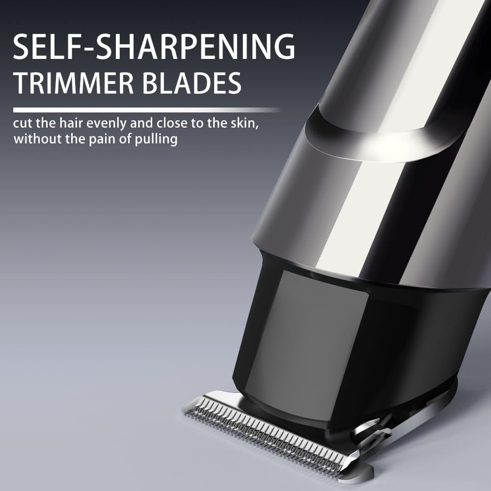 [5 in 1 Beard Grooming Kit] This Trimmer Kit includes 5 trimmer heads for a versatile grooming experience, Multiple functions in one machine that allow you to control the length and style of your beard, body, face, nose, ear, eyebrows, sideburns, neck [Waterproof for Electric Razor] This men's grooming kit is both waterproof and washable, with the detachable blades, help you easy to use and wash it by the included brush. For keeping trimmer good well, you need to put it and all attachments in the base to dry naturally [Safe Shape Blade] The stainless steel moving and standing blades with precision gap, deep close to the skin, more trimming They are also non-corrosive, preventing rust and low friction heat, won't pull hair or burn skin [LED Display and USB Charging] The LED display indicates the battery power and reminds you to charge. This Trimmer features USB charging for easy portability and use on the go. Just charge for 1.5 hours to get 90 minutes of shaving time [Package Included] This Trimmer with 5 different attachment heads, 4 guide combs, storage dock, cleaning brush for beards and mustache trimming, haircuts, touchups, body grooming&detailing Product Description