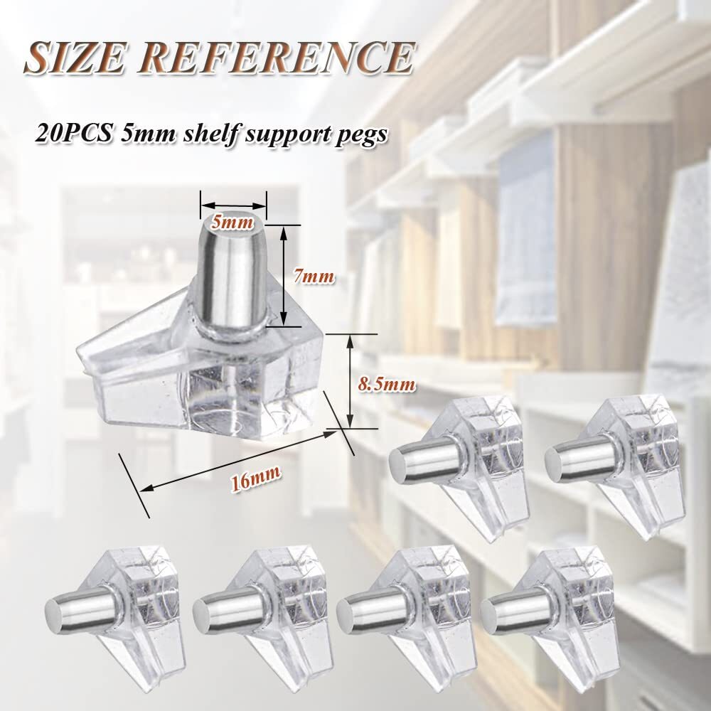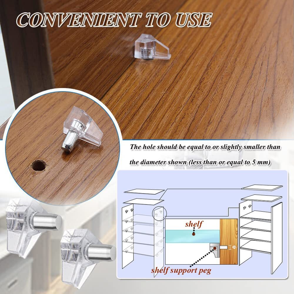 We offer Free Shipping on all order!! Wel come to my stores, The Smart of your choice and satisfaction guarantee. Shelf Support Pegs 5mm Clear Cabinet Shelf Support Pins Plastic Replacement Shelf Holder Pins for Book Shelves Kitchen Cabinet (20pcs Clear) Gallery Product Description Description Premium 20PCS 5mm Shelf Support Pegs for Book Shelves and Kitchen Cabinets for You! Small shelf support pins makes big difference, Made of high quality PVC AND stainless steel, with transparent color, strong and durable, with great bearing capacity, special triangular shape design make it with great stability, so that can support the shelves very well, The cabinet shelf support pegs can be widely used for for cabinet, bookshelf, display cabinet, furniture, wardrobe, closet, cupboard, bookcase, pantry shelving, etc. Features 1.5mm shelf support pegs, fit for 5 mm shelf holes on cabinets shelves 2.made of premium plastic and stainless steel, strong and durable to use 3.triangular shape, with great capacity and stability 4.20pcs kit, enough to meet your daily use and replacement needs 5.great to support cabinet, bookcase, furniture, closet, cupboard, wardrobe, and pantry shelving with 5mm shelf holes Easy to use 1. Use an electric drill to punch, please use the 5mm bit. 2. Put the shelf pin into the hole 3. If the diameter of the hole is bigger the shelf pin, you can wrap a circle around it. 4. Place the baffle on the shelf pin Warm Tips: -Small items, please keep away from the kids under 3 years old -In order to make dowel pins a tight fit, your hole should be equal to or slightly smaller the diameter shown (less or equal to 5 mm) Features 5MM SHELF SUPPORT PEGS KIT --------- You will get 20pcs shelf support pegs with a specification of 5mm, Your hole should be equal to or slightly smaller the diameter shown (less or equal to 5 mm) The quantity is sufficient to meet your daily use and replacement needs. PREMIUM SHELF SUPPORT HOLDER PINS --------- The cabinet shelf support pins are made of transparent PVC and stainless steel, strong and durable, With great bearing capacity, not easy to wear, and can be applied for a long time. CONVENIENT TO USE --------- The shelf holder pins are small in size, light in weight, easy to install, just push support pegs in the hole by hand, you can have a relaxing installation experience. triangular shape features great stability. make sure it can support the shelves very well. WIDELY USED --------- The cabinet shelf support pegs can be widely applied to most furniture in the home, great to support cabinet, bookcase, furniture, closet, cupboard, wardrobe, and pantry shelving with 5mm shelf holes. 100% SATISFACTION GUARANTEED -----We are promise to provide customers on with the product and service, You can Buy our products with utmost confidence, any problems just simple contact us, we guarantee to give you a 100% satisfied solution without any hesitation for sure. Thank you for your business, your trust and your confidence. It is our pleasure to work with our customers. Delivery ☎ If you have any question. Please do not hesitate to contact us. Please send us message via eBay system. We reply every message within 24 hours. If you did not receive our reply. We think maybe we did not receive your message. Please send us message again. Payment Policy ❤ Payment managed by eBay. Shipping Policy We only send the item according to the address on Ebay, the address can't be changed once we pack the item. Please double check your shipping address it before your send the payment. It should take 3-5 business days for the product to reach your destination. If the product doesn't reach your destination within the time limit, please give it an additional 1-2 business days in case of postal delays and/or possible technical issues. We use a selection of shipping services such as UPS, FedEx, USPS etc. We ship only to the 48 contiguous states of America. We do not ship to Hawaii, Alaska, US Protectorates, APO/FPO addresses and PO Boxes. Local pickups are not offered. If it takes any longer than that, please do not hesitate to contact us to resolve the issues. Feedback ❤ We take our reputation seriously, we buy and sell online, so we understand the value of trust. If you are unsatisfied with your order, please contact us and we will work with you to resolve it to your satisfaction. Return Policy ★ This product comes with 30-Days Money Back Guarantee. ★ If you receive an item and it doesn't work properly or you don't like it because of any reason at all. ★ We have a 100% refund/return policy. We will ship you a new item or refund your money for the full sale amount. ★ For all returned products, buyers MUST contact us for the returning address.