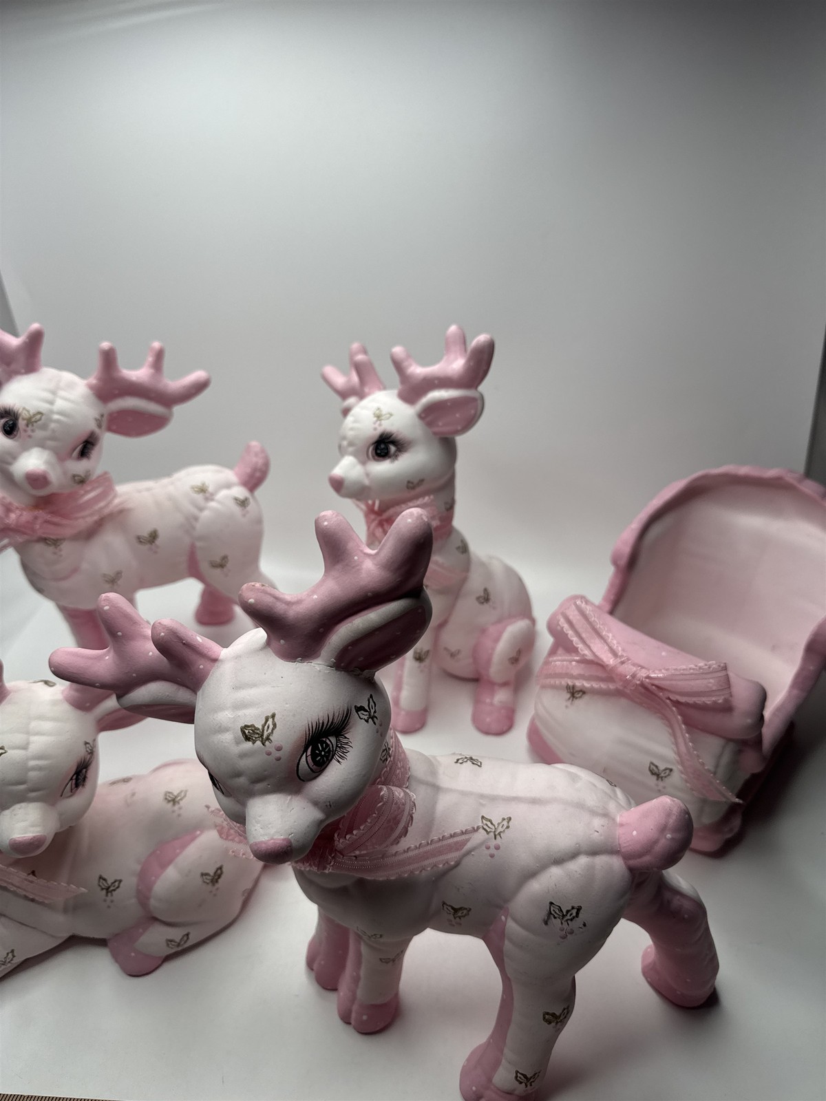 5pc Set of Ceramic Plush Design Pink Reindeer with Sleigh Christmas Decor MCM Item is in vintage pre-owned condition and may show some signs of use and wear/tear. Please check out the pictures and let me know if you have any questions. Thank you for checking out my shop! :) Our hand-selected products are carefully examined, photographed, and stored in a smoke-free environment. Orders received by 2pm ET generally ship the next business day from Pennsylvania via USPS. I'm happy to combine shipping on orders; eBay should provide a combined shipping quote in many cases. I can always combine shipping manually as well if that is helpful.