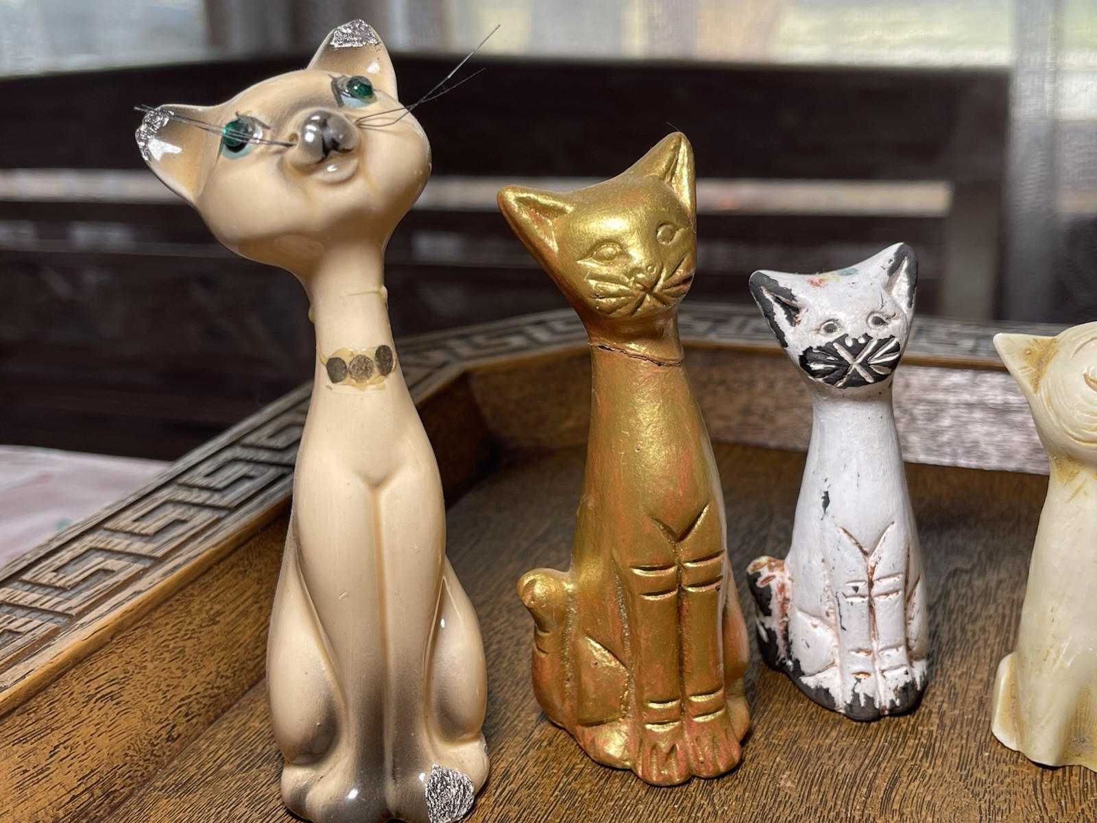 Nostalgic set of 5 different cats kittens felines, all original MCM mid century. 2 have repairs, the gold ct and sparkly eyed cat, neck repairs, but still on so stylish. Clean, adorable, good condition. Safe shipping! Thank you