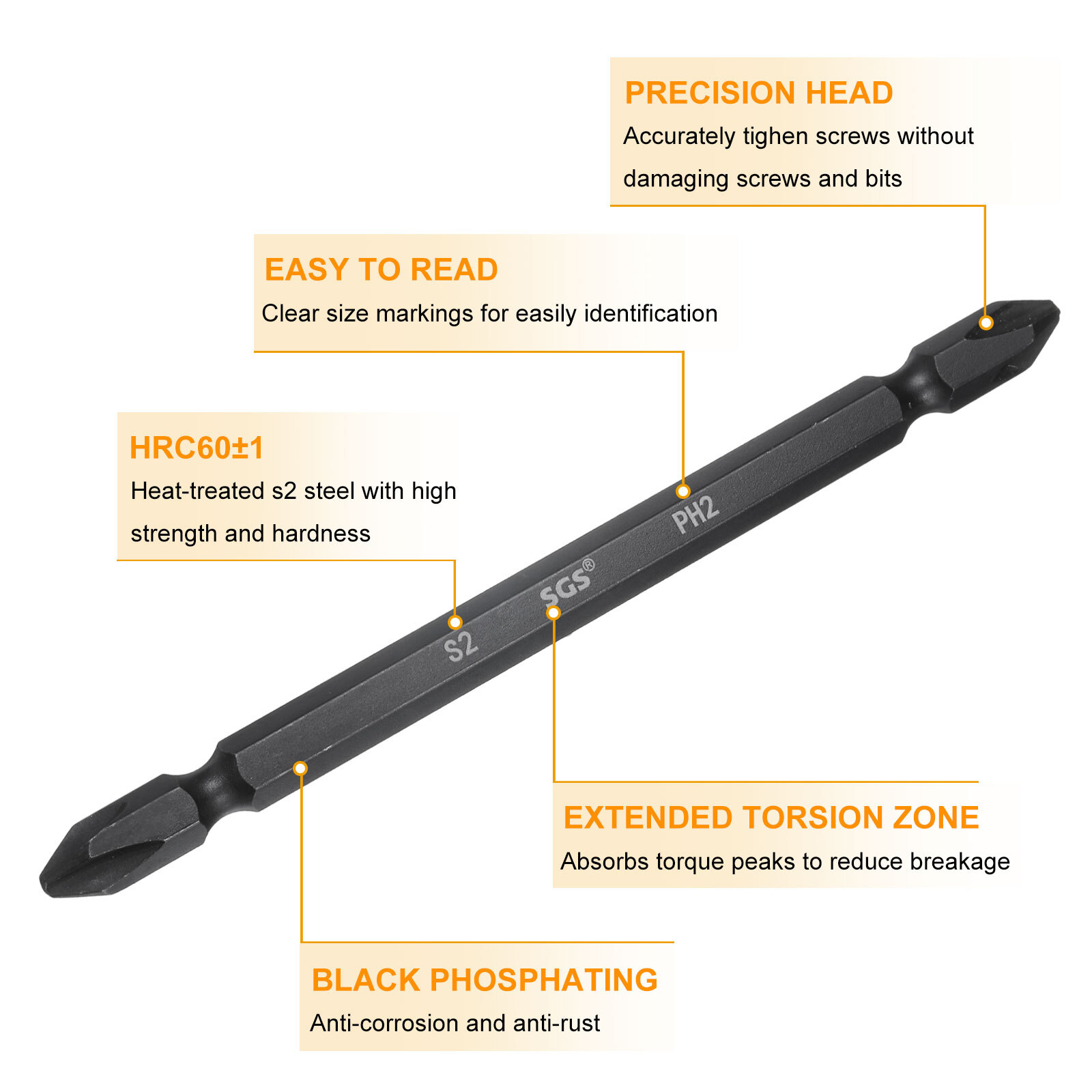 Document The double ended Phillips screwdriver bits are made of heat-treated S2 steel with high strength and hardness(HRC60-62), durable and anti-bending, and the surface is sandblasting and black phosphating treatment for enhanced grip and corrosion resistance.The two sided screwdriver bits are designed with strong magnetism, which can stably absorb the screws vertically or tilted and easily fix the screws, especially in a small space, which can make it more convenient to complete the work.Cross head drill bit specifically designed for driving screws into wood, metal, and other materials effortlessly. Can accurately tighten screws without damaging screws and screwdriver bits.1/4" hex shank driver bits can be used with electric screwdrivers, manual screwdrivers, electric drills, etc. for electricians, mechanical repair work, and furniture installation.Make sure the screwdriver bit is firmly inserted into the power tool chuck before operation. Avoid using excessive forces when tightening the screws to prevent the bit from being damaged or slipping out. Store the screwdriver bit in a dry place to prevent rust and maintain its performance. 5pcs PH2 Magnetic Double Ended Phillips Screwdriver Bit 4.33" Length, Black The double ended Phillips screwdriver bits are made of heat-treated S2 steel with high strength and hardness(HRC60-62), durable and anti-bending, and the surface is sandblasting and black phosphating treatment for enhanced grip and corrosion resistance. The two sided screwdriver bits are designed with strong magnetism, which can stably absorb the screws vertically or tilted and easily fix the screws, especially in a small space, which can make it more convenient to complete the work. Cross head drill bit specifically designed for driving screws into wood, metal, and other materials effortlessly. Can accurately tighten screws without damaging screws and screwdriver bits. 1/4" hex shank driver bits can be used with electric screwdrivers, manual screwdrivers, electric drills, etc. for electricians, mechanical repair work, and furniture installation. Make sure the screwdriver bit is firmly inserted into the power tool chuck before operation. Avoid using excessive forces when tightening the screws to prevent the bit from being damaged or slipping out. Store the screwdriver bit in a dry place to prevent rust and maintain its performance. Hot Item Payment 1.We accept eBay payment . 2.Payment must be received within 7 business days of auction closing. Shipping 1.We ship to your eBay or Paypal address. Please make sure your eBay and Paypal address is correct before you pay. 2.Items will be shipped within 1-3 business day when we received payment. 3.Delivery time depends on destination and other factors. Description Policy 5pcs PH2 Magnetic Double Ended Phillips Screwdriver Bit 4.33" Length, Black The double ended Phillips screwdriver bits are made of heat-treated S2 steel with high strength and hardness(HRC60-62), durable and anti-bending, and the surface is sandblasting and black phosphating treatment for enhanced grip and corrosion resistance. The two sided screwdriver bits are designed with strong magnetism, which can stably absorb the screws vertically or tilted and easily fix the screws, especially in a small space, which can make it more convenient to complete the work. Cross head drill bit specifically designed for driving screws into wood, metal, and other materials effortlessly. Can accurately tighten screws without damaging screws and screwdriver bits. 1/4" hex shank driver bits can be used with electric screwdrivers, manual screwdrivers, electric drills, etc. for electricians, mechanical repair work, and furniture installation. Make sure the screwdriver bit is firmly inserted into the power tool chuck before operation. Avoid using excessive forces when tightening the screws to prevent the bit from being damaged or slipping out. Store the screwdriver bit in a dry place to prevent rust and maintain its performance. Hot Item Payment 1.We accept eBay payment . 2.Payment must be received within 7 business days of auction closing. Shipping 1.We ship to your eBay or Paypal address. Please make sure your eBay and Paypal address is correct before you pay. 2.Items will be shipped within 1-3 business day when we received payment. 3.Delivery time depends on destination and other factors.