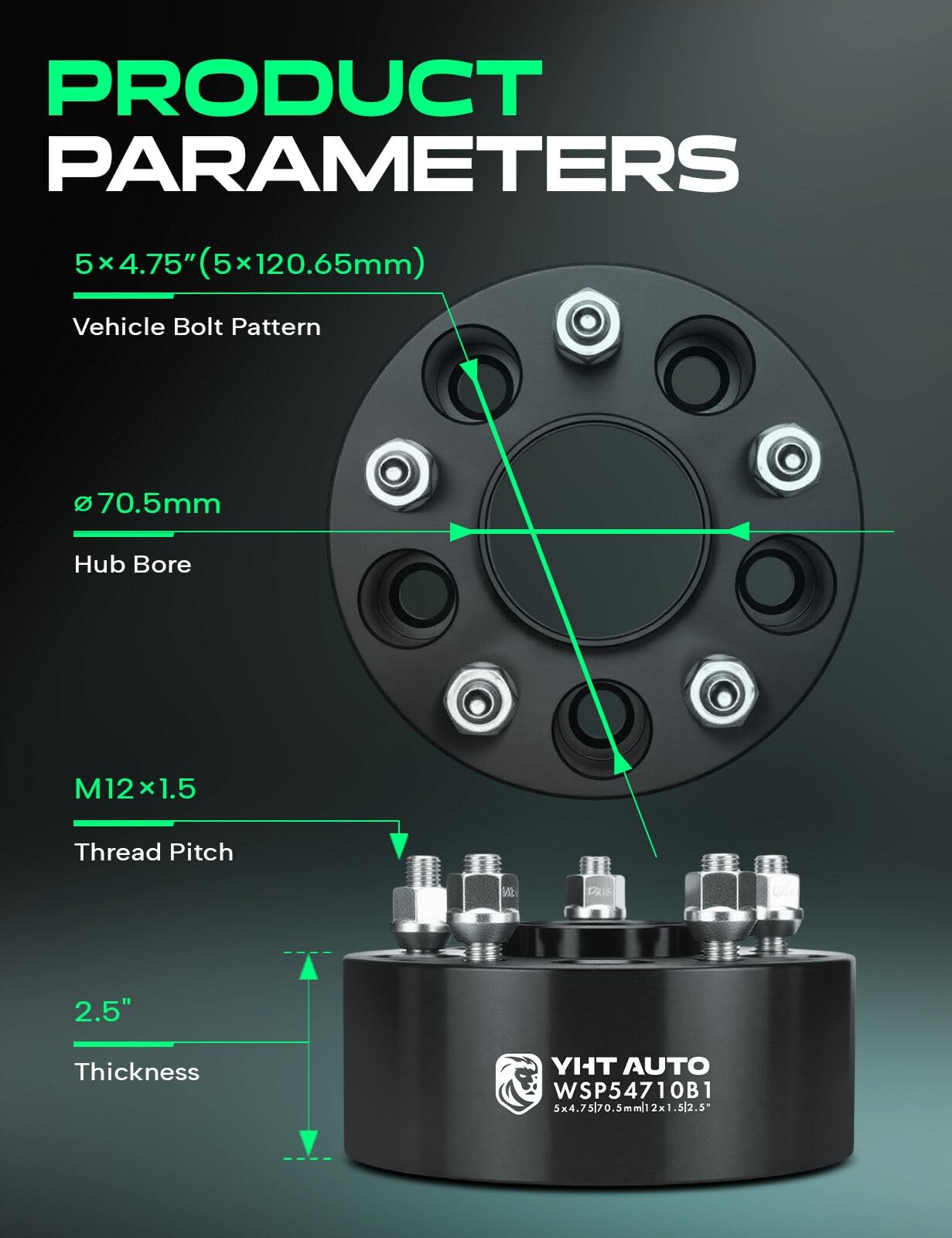 5x4.75 Hub Centric Wheel Spacers 2.5 Inch Compatible with Chevrolet, GMC, Buick, Cadillac, Pontiac Models Tire Spacers w/ M12x1.5 & 12.9 Grade Studs, 70.5mm Hub Bore 5 Lug 4PCS Black About this item 1、Custom Fit 5 Lug Wheel Spacers: The spacers for car---Compatible with Chevrolet, Cadillac, GMC, Buick and Pontiac Models: 1982-2002 Camaro| for 1984-2019 Corvette| 1987-2005 Blazer| 1982-2004 S10| 1983-1994 S10 Blazer| 1979-1985 Eldorado| 2004-2009 XLR| 1991-2005 Jimmy| 1982-1990 S15| 1991-2004 Sonoma| 1979-1985 Riviera| 1982-2002 Firebird; For full models refer to the amazon garage tool or our picture 2、About the Tire Spacers: 5x120.65mm(5x4.75) vehicle PCD (bolt pattern) and 70.5mm hub bore must match | 2.5 inch thickness, this is also the size at which the wheels will be pushed out | M12x1.5 Studs & Lug Nuts| Recommended torque:45-55 FT/LBS | 12.9 grade studs, highest grade of bolt strength 3、Hubcentric Bolt-On Wheel Spacers: Tire Spacers have a lip that fits around your vehicle's hub. Spacers put all the pressure right back onto the hub and are more secure than lug centric spacers and you don't need to buy hub centric rings separately 4、Safety Tips for Installers: The fear with any spacer is that it will come loose. To prevent this, be sure to not only follow the recommended torque specifications, check regularly for looseness and tighten to the recommended torque, but use high-strength thread locker we are equipped with on the stock studs that the spacer bolts to 5、What You Will Get: 4pcs 5x4.75 wheel spacers and 1pc installation instructions; Once installed, gives the truck the clearance and tougher look you want, and handles much better Free Shipping to Most US area! Please note that Certain automotive parts may be subject to regulatory restrictions in the state of California (CA), which can prevent us from shipping these items to addresses within CA. Destinations including Puerto Rico (PR), U.S. Virgin Islands (VI), Guam (GU), Northern Mariana Islands (MP), (AS) , (AK) ... are considered U.S. territories but may be subject to extended delivery timelines and additional shipping fees due to their remote locations. We encourage customers placing orders to these areas to contact us prior to completing your purchase, so we can confirm shipping availability and any potential surcharges. Thank you for your understanding. On Apr 1, 2026 at 12:18:59 PDT, seller added the following information: