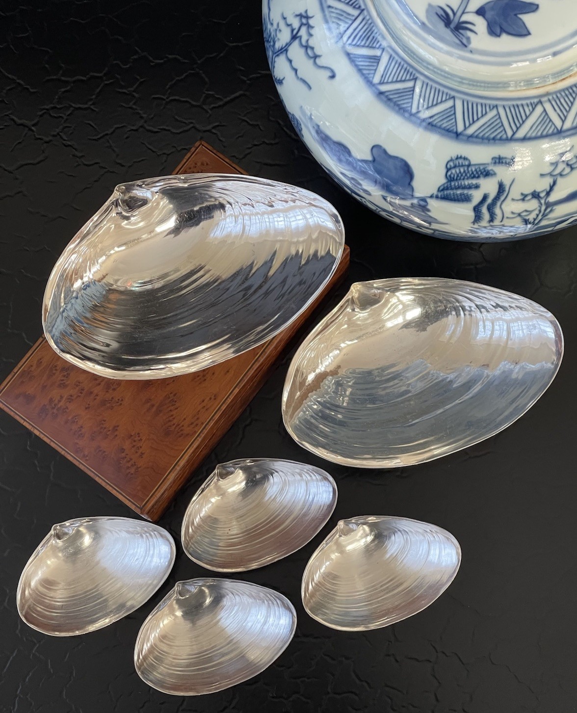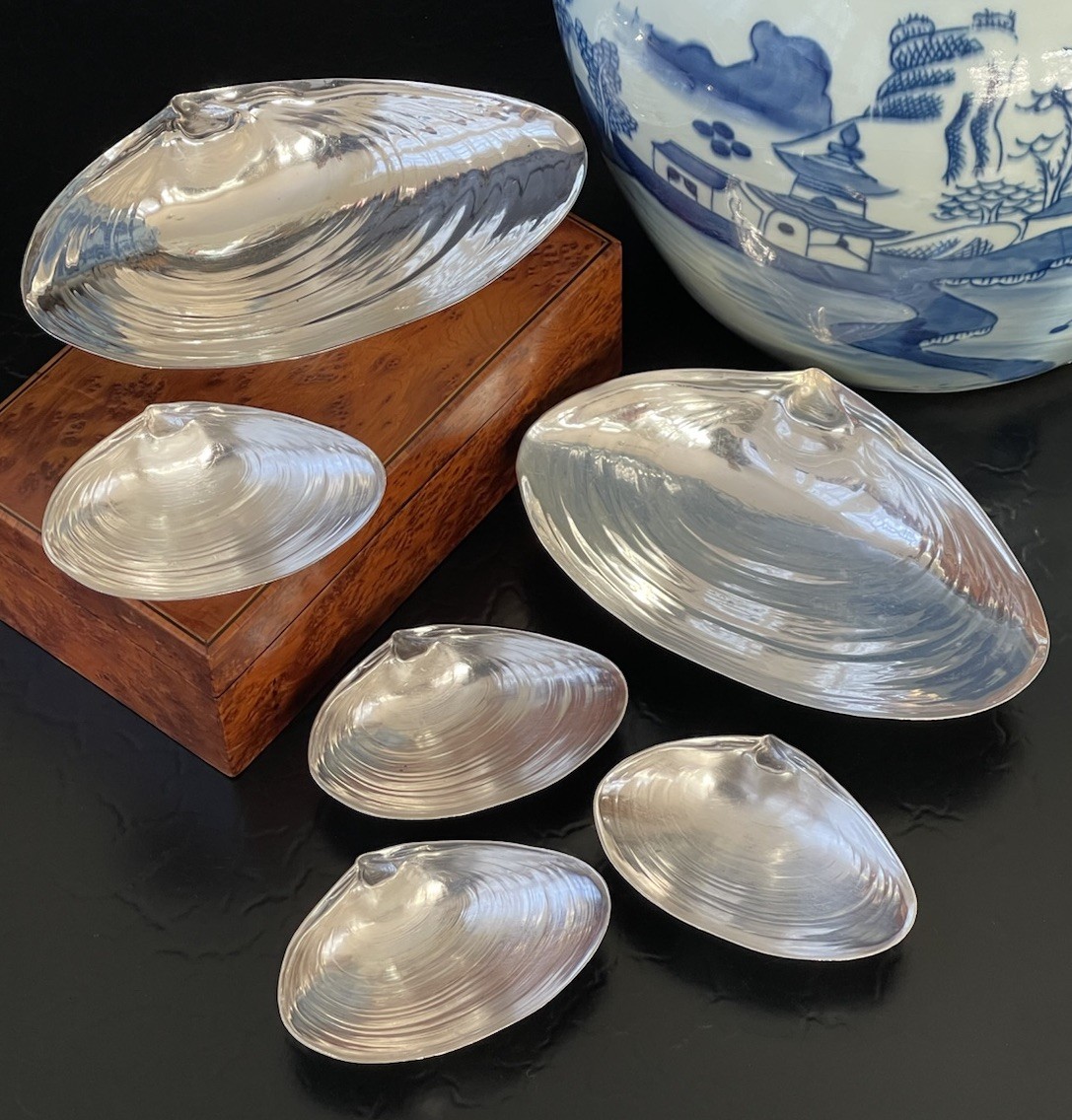 Here we have a lovely very rare Wallace Silver Company pattern #363, master serving, dining, display set. This fine collection consists of six vessels, a rare large master 6.25” length/4.25” width scallop shell form bonbonniere dish pair and four 3.5” length/2.5” width individual serving dishes. A glorious example of American heritage and style to own and treasure in this full curated collection in elegant turn of the century aesthetic. Minimal expected age related wear, kindly view photos. With care and gentle use these special vessels will maintain and only improve in their intrinsic luster and beauty. Stunning examples. Each piece shows beautifully. Total weight 9.590 ozt. Endless possibilities.