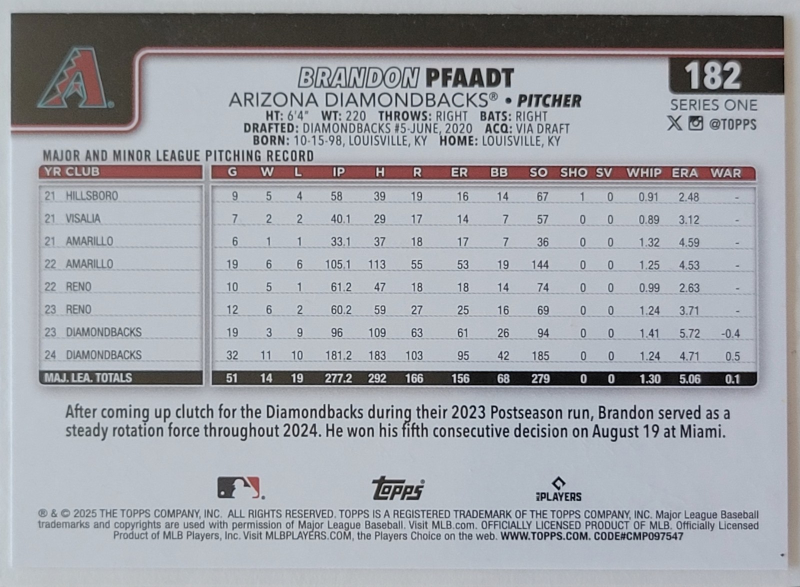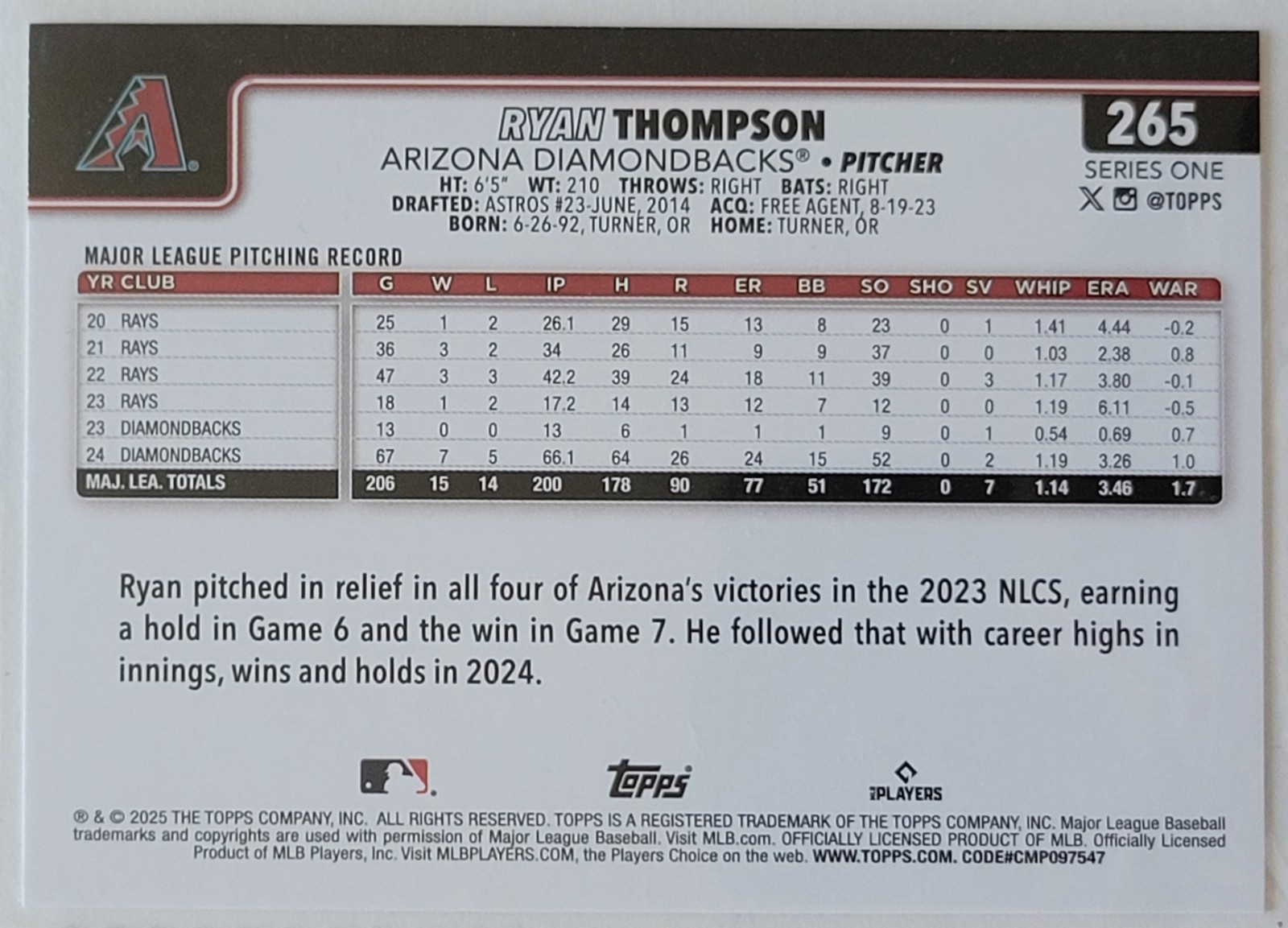The cards are in very good to excellent condition. Look at photos for reference. The 6 cards for sale in this listing include: 2025 Topps Series 1 Card #265 Ryan Thompson 2025 Topps Series 1 Card #120 Cristian Mena Rookie Card 2025 Topps Series 1 Card #182 Brandon Pfaadt 2025 Topps Series 1 Card #328 Eugenio Suarez 2025 Topps Series 1 Card #243 Jake McCarthy 2025 Topps Heritage Card #287 Merrill Kelly Will ship nonmachinable using EBay standard envelope for cheaper shipping costs and secured shipping. Thanks for viewing this listing and feel free to check out more of my listings. Happy collecting!