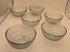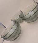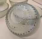 The product is a set of 6 Juniper Sage cereal bowls in light green color with clear glass. These round bowls feature a glossy finish and raised dot pattern, making them suitable for all occasions. The brand Fortessa offers these original cereal bowls under their Forest Green product line. Each bowl has a height of 2.25" and width of 5", and they are dishwasher safe for easy cleaning. Perfect for teens, boys, adults, and girls, these stylish and functional cereal bowls add a touch of elegance to any dining experience. No cracks, no scratches or chips. Thank you for viewing.