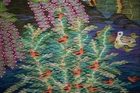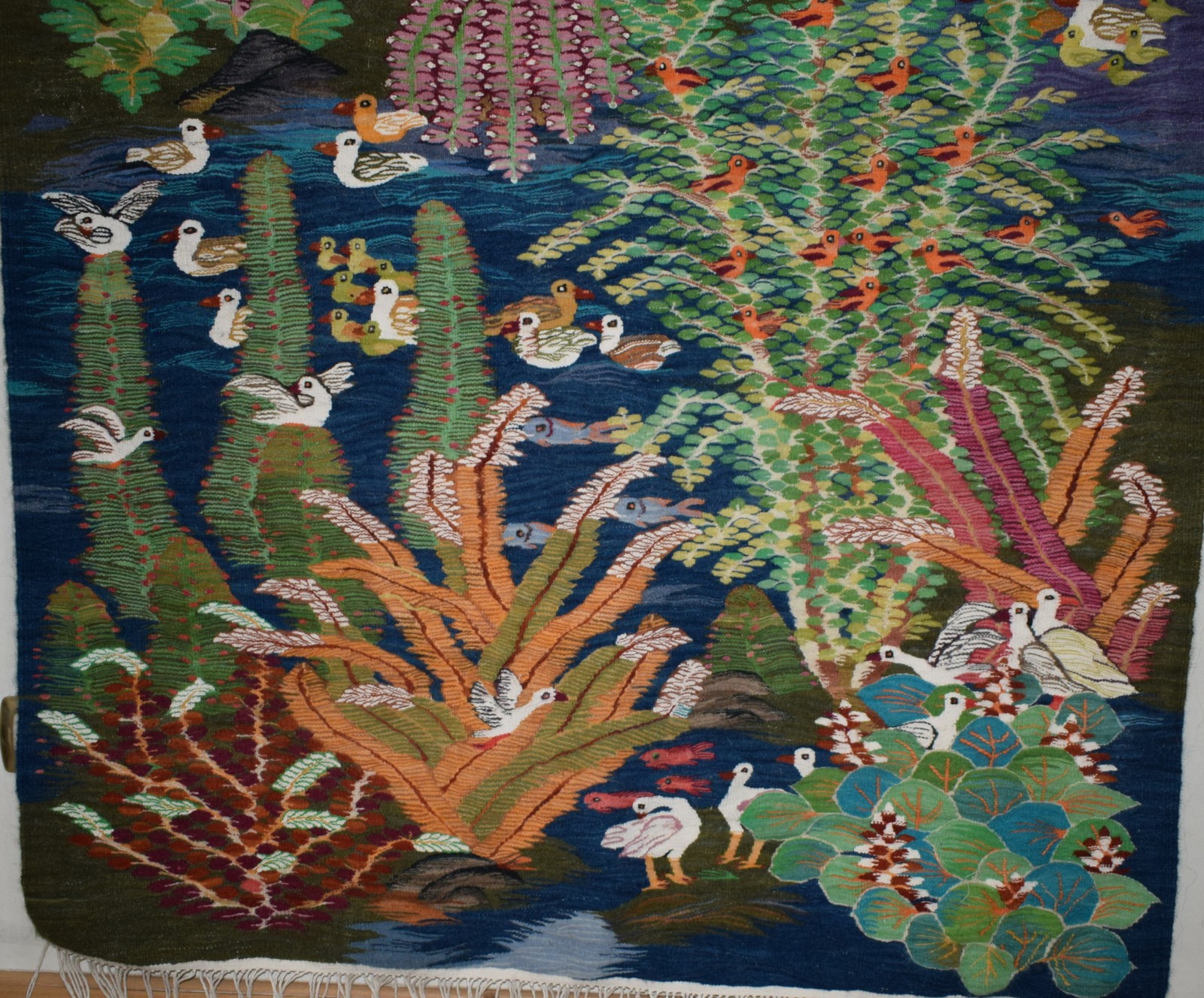 6 FT Handwoven Egyptian Kilim Rug Wall Hanging Tapestry Garden Ducks Birds Pink 6 FT Handwoven Egyptian Kilim Rug Wall Hanging Tapestry Garden Ducks Birds Pink Handwoven Egyptian Tapestry — Natural Dye Wool Thread — Artisan Wall Art — Wissa Wassef Style Experience the beauty of authentic Egyptian handwoven tapestry, crafted using natural plant-based dyes on high-quality wool threads. What makes each piece truly extraordinary is that the skilled artisans weave entirely from imagination — without sketches or guides — improvising every detail as they work. This rare mastery ensures that no two pieces are alike, making each tapestry a one-of-a-kind expression of artistic genius. The natural dyes give vibrant, long-lasting colors while being eco-friendly. This is a showpiece — a large, richly detailed scene with a cascading pink flowering tree at the center, surrounded by lush tropical plants, ferns, and succulents. Ducks swim in deep blue water, white birds perch among the foliage, and vibrant orange coral-like plants fill the lower half. Incredible color depth from top to bottom — greens, blues, pinks, oranges, and teals all woven together. Size: 6.0 x 3.8 ft / 71.5 x 46 inches / 182 x 117 cm (approx.) Can be used as a rug, wall hanging, or decorative throw