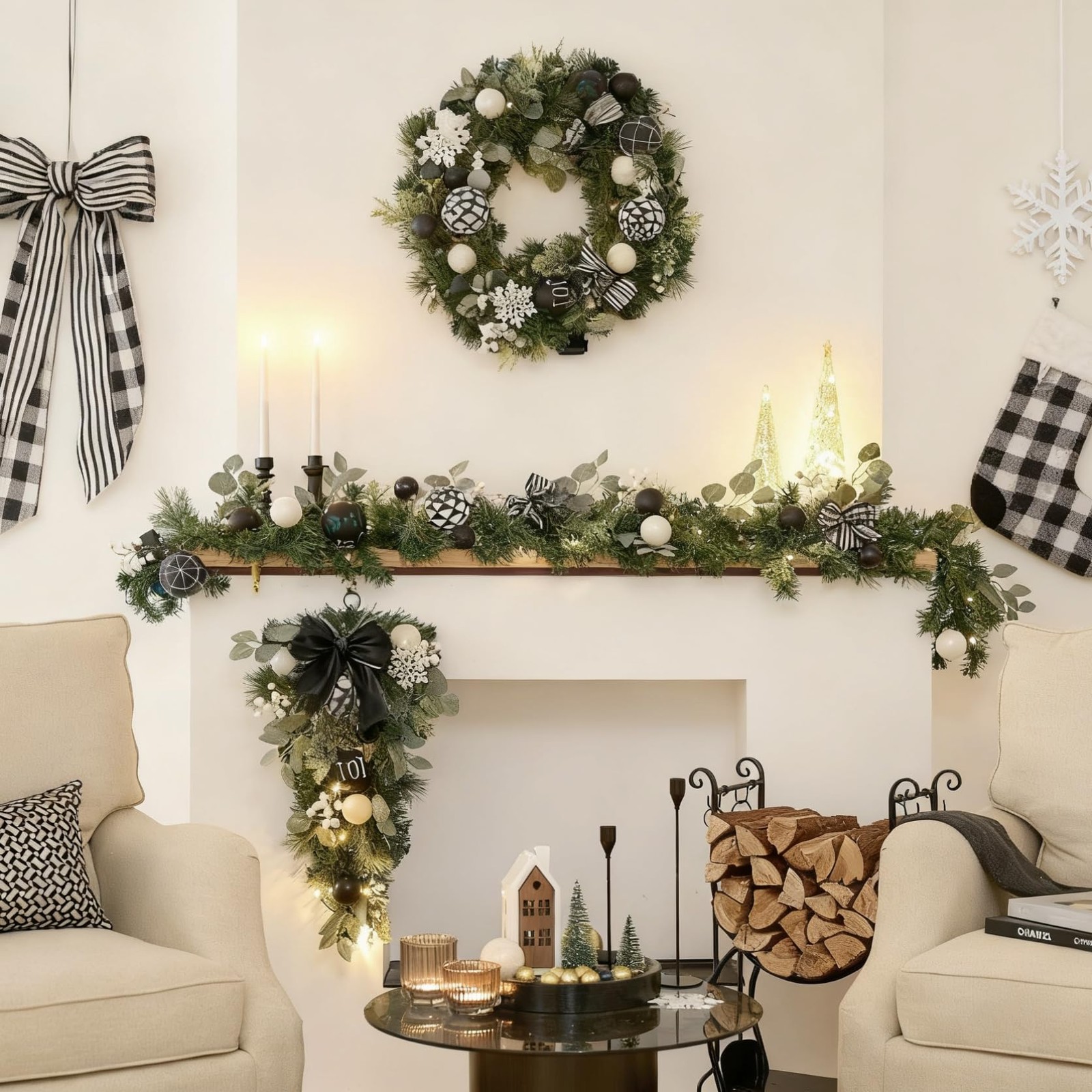 6 Feet Pre-Lit Christmas Garland with Lights for Mantle, Lighted Outdoor Xmas Garland with Black White Balls Bow for Home Stairs Fireplace Table Centerpiece Indoor Holiday Party Decor 【Original Design】is a retail brand with original design. In the world of Modern Luxury, monochrome dreams unite, where black and white colors ignite brilliance and shadows. Adorn your tree with timeless delight. 【Abundant Accessories】The 6ft Christmas garland features an artificial crestwood fir branch base, adorned with rich elements such as ribbons, Christmas ornaments, berries, and more. This exquisite design creates a classic scene that brings a delightful festive atmosphere. To showcase it at its best, kindly remove the wreath from the box and carefully arrange and expand it 【Automatic Switch】Simply switch it to the "ON" position, and the lights will illuminate for 6 hours before automatically turning off for 18 hours. This means that it will automatically light up at the same time every day when you initially turn on the lights. It offers convenient and easy operation 【Versatile Use】This garland is suitable for both indoor and outdoor use. It can be hung on walls, fireplaces, windows, stairs railing or placed above the entrance or on a mantel. It can also serve as a centerpiece on a tabletop, offering a warm welcome to family and friends. Additionally, it makes a wonderful Christmas gift 【More Options】The Christmas garland pairs perfectly with our Christmas wreath, plastic ball ornaments, tree skirts, stockings, and more, allowing you to create a harmonious and visually appealing holiday look for your home 【Christmas Vibe】This beautiful hanging garland is perfect for adding a festive touch and warmth to your home during the Christmas season. Its eye-catching design will make your decorations stand out in the neighborhood, spreading holiday cheer to all!