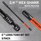About this item [Advantage of DYRECELVE] Embrace professional-grade, authentic tools from an esteemed international brand, empowering over 2 million users with our cutting-edge technology [Long Torx Bit Set 6-Inch] This 8-Pack torx bit with hole in center of has a length of 6 inches, including T8, T10, T15, T20, T25, T27, T30, T40. Each drill bit is clearly labeled with its size [Upgraded Industrial Strength Material] Long Torx Security Bit Set are made of solid S2 alloy steel with a hardness reaching 60 HRC, torsion zone to absorb torque peaks to avoid breakage [CNC Machined Tips] This tamper proof torx bit set and is of torx security bits. It features a quenched core and a manganese phosphate surface. 1/4'' Hex-Shank quick release, with a bit holder [Enhanced Magnetic] Impact magnetic torque bits facilitate screw retrieval, and the magnetism remains intact even after multiple uses, so you don't have to worry about its decay over time [What You Get] A set of 8 professional-grade 6 inch Long star bit sets for home repairs, repairing electronic products, auto repairs, woodworking and other screw driving applications. It is an essential tool for DIY enthusiasts and mechanics Shipping We offer FREE shipping on all orders! We ship within Three business days of payment, usually sooner. We use a selection of shipping services such as UPS, FedEx, USPS etc. We only ship to the lower 48 states, no APO/FPO addresses or PO Boxes allowed. Local pickups and combined shipping options are not provided at this time. Return You can return a product for up to 30 days from the date you purchased it. Any product you return must be in the same condition you received it and in the original packaging. Please keep the receipt. Payment We accept payment by any of the following methods: PayPal Please pay as soon as possible after winning an auction, as that will allow us to post your item to you sooner! Feedback Customer satisfaction is very important to us. If you have any problem with your order, please contact us and we will do our best to make you satisfied. Contact Us If you have any queries, please contact us via ebay. We usually respond within 24 hours on weekdays. Please visit our eBay store to check out other items for sale! Thank you for shopping at our store. Disclaimer We are working with different suppliers in usa to deliver the item to your doorstep. If you have any issues regarding the item, Feel free to ask.