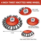 1.PACK INCLUDED: 4” knotted wire wheel*4, 3” knotted wire cup*2 2.HEAVY DUTY WORK: The wire wheel set is ideal for heavy duty work, it consisted of knotted carbon steel wire to perfectly remove rust,paint,burrs,spatters,corrosion and so on. The combination of 4” wire wheels and 3” wire cup can meet different requirements of the work. 3.PARAMETERS: This angle grinder wire brushes are constructed of 0.02” knotted high carbon steel wires, 5/8-11 UNC standard threaded arbor, running speed is up to RPM 12,500. 4.SAFETY AND STABILITY: The grinder wire brushes are coated with both sided hard steel plates to hold the wires better so as to prevent it from flying and falling. Carbon steel wires will secure a long durability to save the money. 5.IDEAL COMBINATION: This set of wire brushes provide 2 kinds of angle grinder brushes to meet different requirements of the heavy duty work. It will improve the grinding efficiency by using correct type of brush to increase the productivity.