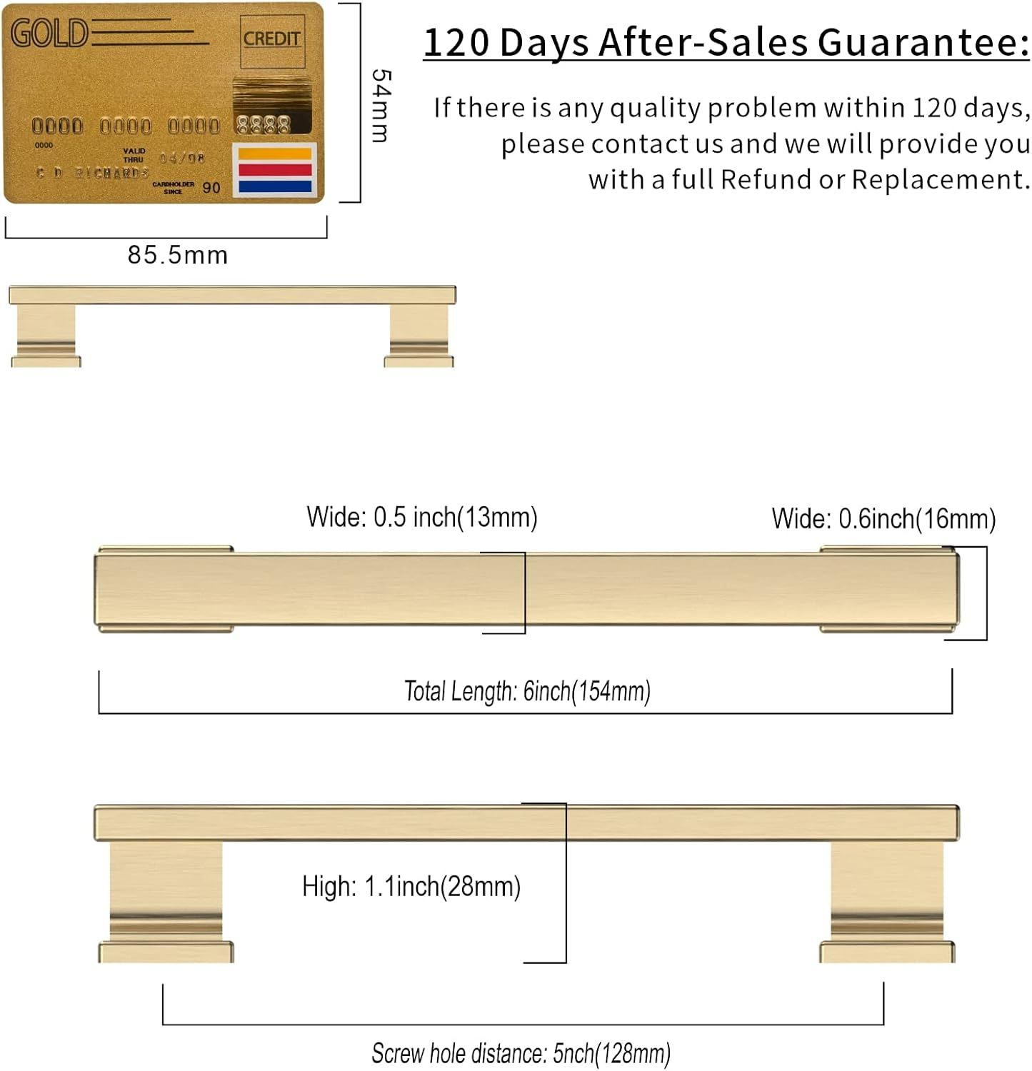 Asidrama brand assurance: We take your user experience very seriously and we are so confident in the quality of our products that we will replace them if there is any quality problem. Asidrama cabinet hardware:6 Pack 5 Inch Brushed Brass Cabinet Handles.Each handle is individually securely packaged to prevent bumps and scratches. Made of zinc alloy with a Brushed Brass finish, the Asidrama pull is a heavy duty cabinet pull that is strong. Standard screw spacing for easy installation and replacement. Wide range of application: Asidrama furniture pulls are ideal for cabinets, closets, cupboards, drawers, dressers, doors and wardrobes. You can upgrade your home with your DIY. Measurement: Hole Centers(CC):5 inch(128MM); Overall Length:6 inch(154MM); Width:0.5 inch(13MM); Projection:1.1 inch(28MM); Please check the Size of handles you require carefully before purchasing. Product Description Asidrama is a group of passionate and talented cabinet hardware designers who are dedicated to creating great furniture hardware products and sharing them with everyone around the world. You can enjoy the process of DIY home decoration with more value than you can imagine.