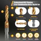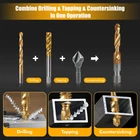 【ALL-IN-ONE HIGH-EFFICIENCY TOOL】 Experience seamless drilling, tapping, and countersinking with our 3-in-1 combination drill tap set. It eliminates the need to switch tools midway, saving you time and costs while boosting work efficiency. A must-have for both DIYers and professionals 【VERSATILE PERFORMANCE】 Perfect for fabricating aluminum, plastic, wood, fiberglass, and other thin soft metals (under 1/8" thick), this tap and drill set delivers reliable performance from workshops to DIY projects. Note: Not suitable for high-hardness metals and stainless steel 【WIDE APPLICATION & COMPATIBILITY】 drill tap bits set including 6 sizes sae tap - 6-32nc 8-32nc 10-32nc 10-24nc 12-24nc 1/4-20nc, with 1/4-inch hex quick-change shank, our drill and tap bit set fits variety power tools, like electric hand drill, impact drill, bench drill, electric screwdriver and other tap machines, ensuring versatility across different applications & scenarioes 【USER-FRIENDLY DESIGN】Each thread tap drill bit is clearly engraved with its size on the hex shank for easy identification. The hex handle’s tapered end minimizes excessive impact, while the extended back taper prevents over-drilling and thread damage. A practical tool for precise and hassle-free use 【IMPORTANT TIPS FOR BEST RESULTS】 Use cutting oil, drill slowly, and ensure the tapping drill bit set is fully aligned and level to ensure straight tapping holes. Apply gentle pressure to prevent thread damage. For safety, always wear protective eyewear while using this threaded drill bits set