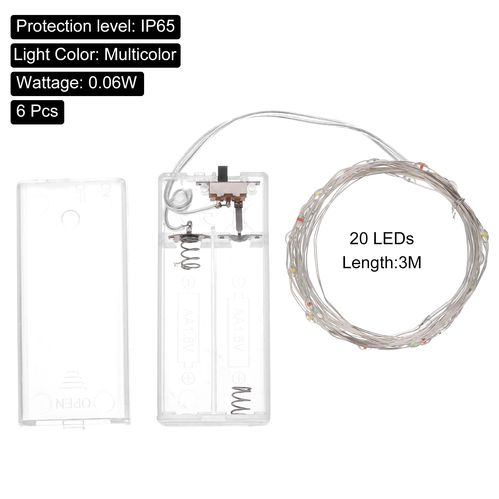 Document What is this?This twinkle lights battery operated featuring high brightness LED bulbs and flexible copper wire, Battery powered design ensures convenience for both indoor and outdoor use. With IP65 waterproof wiring, the light button control allows for easy adjustment, adding a warm atmosphere to your home, parties, or outdoor events. What will I get?Light Color: MulticolorMaterial: Plastic, CopperNumber of Light Sources: 20 LEDsIngress Protection: IP65Wattage: 0.06WLight Mode: Always onIn the package: 6 Pack x LED Battery operated lights Are there any advantages of the product?The battery powered led lights crafted with thin, bendable copper wire that can be shaped around, durable combination of copper wire and LED bulbs offers long-lasting illumination and aesthetic lighting. How to use it?Simply insert batteries to the battery case, switch to your desired mode (ON/OFF), and enjoy the ambiance, the bulk fairy lights are suitable for a variety of decorative applications such as Wedding/Christmas/Halloween/Thanksgiving. What should I notice?The battery is not included here. Only the warm fairy lights are waterproof, the battery pack is not waterproof. 50Pcs Aluminum Solar Panel Mounting Brackets-Mid Clamp for Framed Panels USD 47.26 15mm x 7mm Plastic LED Light Strip Fixing Mounting Bracket Clear 100pcs USD 22.63 6 Pack LED Fairy Lights Battery Operated 20 LEDs 10 Feet Multicolor Lights What is this? This twinkle lights battery operated featuring high brightness LED bulbs and flexible copper wire, Battery powered design ensures convenience for both indoor and outdoor use. With IP65 waterproof wiring, the light button control allows for easy adjustment, adding a warm atmosphere to your home, parties, or outdoor events. What will I get? Light Color: Multicolor Material: Plastic, Copper Number of Light Sources: 20 LEDs Ingress Protection: IP65 Wattage: 0.06W Light Mode: Always on In the package: 6 Pack x LED Battery operated lights Are there any advantages of the product? The battery powered led lights crafted with thin, bendable copper wire that can be shaped around, durable combination of copper wire and LED bulbs offers long-lasting illumination and aesthetic lighting. How to use it? Simply insert batteries to the battery case, switch to your desired mode (ON/OFF), and enjoy the ambiance, the bulk fairy lights are suitable for a variety of decorative applications such as Wedding/Christmas/Halloween/Thanksgiving. What should I notice? The battery is not included here. Only the warm fairy lights are waterproof, the battery pack is not waterproof. Hot Item 15mm x 7mm Plastic LED Light Strip Fixing Mounting Bracket Clear 100pcs USD 22.63 50Pcs Aluminum Solar Panel Mounting Brackets-Mid Clamp for Framed Panels USD 47.26 Payment We accept eBay payment. Please do not email us to ask for other payment option. We appreciate prompt payment and look forward to your business in the future. Unpaid item will be filed without receiving payment in 7 days from listing ended. Shipping Usually we ship your order out within 24 hours in business day. For shipping and handling charges (S&H) for specific item, please refer to the item listing page for more details. Please make sure your shipping address is correct. We are not responsible for any loss in transit if a wrong address is provided. Return Policy Returns for exchange are permitted and must be initiated by the buyer within 30 days upon receipt. If you would like to return your product(s) for repair / replacement / refund, please kindly contact our customer service representatives via email for an authorized RMA number. Your returned product(s) will not be processed without a completed RMA. About Us We are continually expanding our product selection to better serve your need. We look forward to providing the best sevice to you - our dear customers, so take a look around our store and find the product that you want. You can put your trust in us! If you need any help or have any suggestions, please don't hesititate to contact us anytime , we will reply you within 24 hours and try the best to help you. Description Policy 6 Pack LED Fairy Lights Battery Operated 20 LEDs 10 Feet Multicolor Lights What is this? This twinkle lights battery operated featuring high brightness LED bulbs and flexible copper wire, Battery powered design ensures convenience for both indoor and outdoor use. With IP65 waterproof wiring, the light button control allows for easy adjustment, adding a warm atmosphere to your home, parties, or outdoor events. What will I get? Light Color: Multicolor Material: Plastic, Copper Number of Light Sources: 20 LEDs Ingress Protection: IP65 Wattage: 0.06W Light Mode: Always on In the package: 6 Pack x LED Battery operated lights Are there any advantages of the product? The battery powered led lights crafted with thin, bendable copper wire that can be shaped around, durable combination of copper wire and LED bulbs offers long-lasting illumination and aesthetic lighting. How to use it? Simply insert batteries to the battery case, switch to your desired mode (ON/OFF), and enjoy the ambiance, the bulk fairy lights are suitable for a variety of decorative applications such as Wedding/Christmas/Halloween/Thanksgiving. What should I notice? The battery is not included here. Only the warm fairy lights are waterproof, the battery pack is not waterproof. 50Pcs Aluminum Solar Panel Mounting Brackets-Mid Clamp for Framed Panels USD 47.26 15mm x 7mm Plastic LED Light Strip Fixing Mounting Bracket Clear 100pcs USD 22.63 Hot Item 15mm x 7mm Plastic LED Light Strip Fixing Mounting Bracket Clear 100pcs USD 22.63 50Pcs Aluminum Solar Panel Mounting Brackets-Mid Clamp for Framed Panels USD 47.26 Payment We accept eBay payment. Please do not email us to ask for other payment option. We appreciate prompt payment and look forward to your business in the future. Unpaid item will be filed without receiving payment in 7 days from listing ended. Shipping Usually w