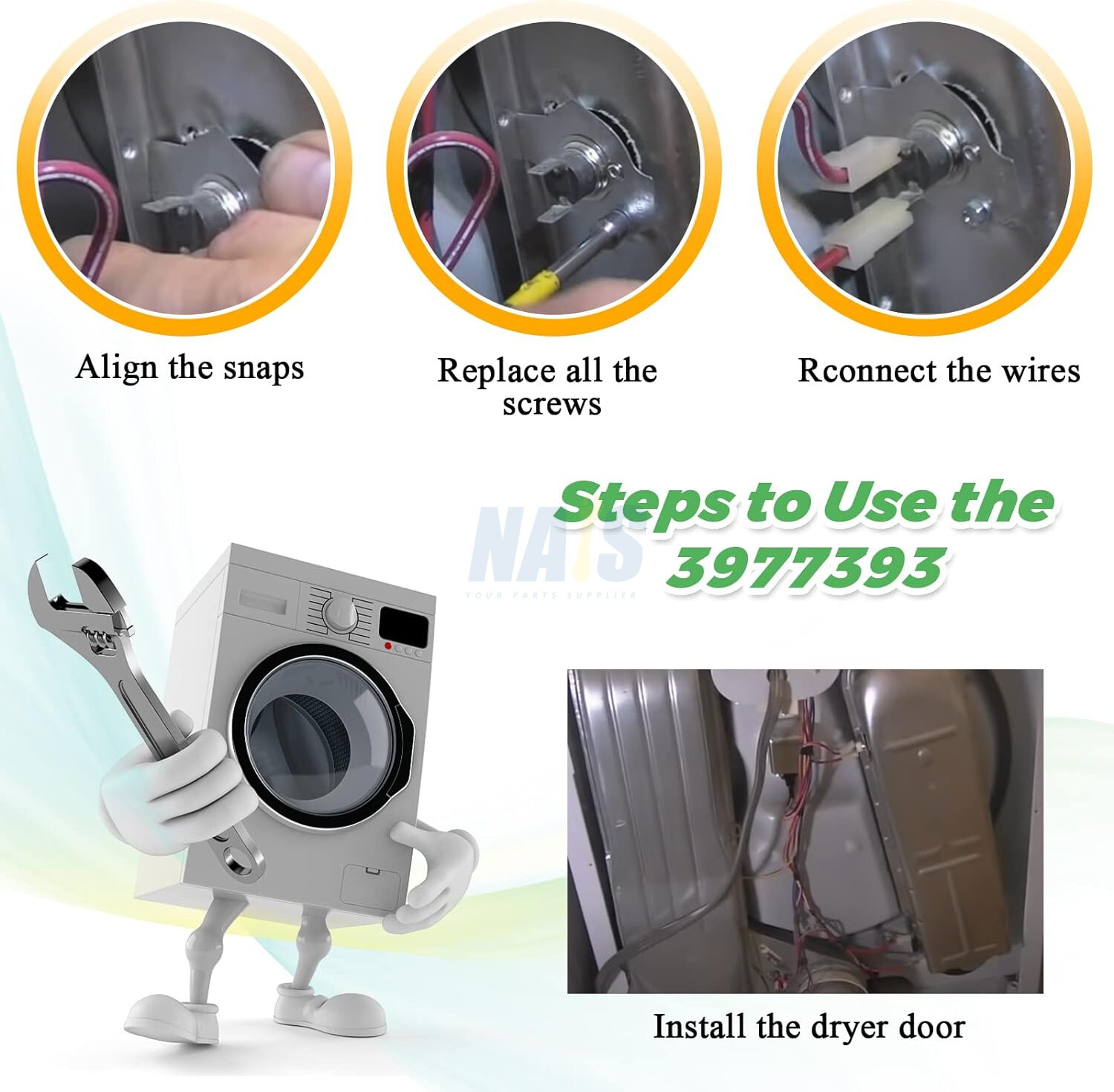 IMPORTANT: Please check the model number carefully before ordering. If you're unsure about the compatibility, send us your dryer model number and we can help you confirm if it fits or not. 100% PROTECTION: Enjoy reliable performance with our lifetime protection, ensuring that your product will always be covered for any defects or issues that may arise. MODEL NUMBER: 3977393 Dryer Thermal Fuse (309 degrees). It is an essential part of the dryer that prevents the dryer from overheating. If the dryer's high limit thermostat fails in a closed circuit condition, this fuse will fail and the dryer will stop working. EASY TO INSTALL: It is made exactly fit for most top name brands (Whirlpool, Kenmore, Maytag, Roper, KitchenAid, Crosley, Estate, Inglis, Amana, Admiral, Magic Chef), fits models: [Kenmore] 110.6012990, 11060012000, 11060012002, 11060022010, 11060022010, 11060172000, etc. [Whirlpool] 3HLER5437JQ0, 3DWED5605SQ0, 3DWED4900YW2, 3HLER5437JQ2, 3HLER5437JQ3, LER6634BW2, LER5620KQ0, etc. Replaces part numbers: 279816, 3399848, AP3094244, PS334299, 279816VP, 2651, EAP334299, PD00002348. SAVE TIME AND SAVE MONEY: Inexpensive way to fix or repair a dryer. It will take you 15-30 minutes to repair, and you will just need a quarter-inch nut driver and a flathead screwdriver. This part fixes the following symptoms: No heat or not enough heat | Takes too long to dry | Will not start | Too hot. On Apr 3, 2025 at 01:52:57 PDT, seller added the following information:
