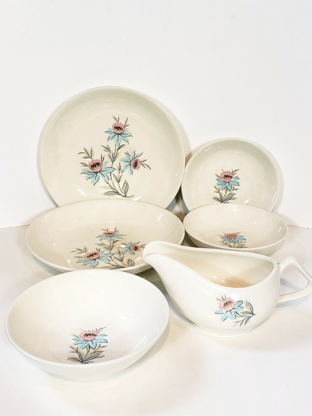 6 Pcs Steubenville Pottery Fairlane Gravy Boat 8" / 6"/ 5 1/4" Bowls. Lot of 6 pieces Gravy boat , two 8" soup bowls or cereal some salad maybe in case you like alot of dressing , two 5 1/4" berry bowls or ketchup for the fries and one 6" bowl for salsa or sour cream and hot sauce for your fries . No chips or cracks o and the gravy boat yep some gravy for your fries.