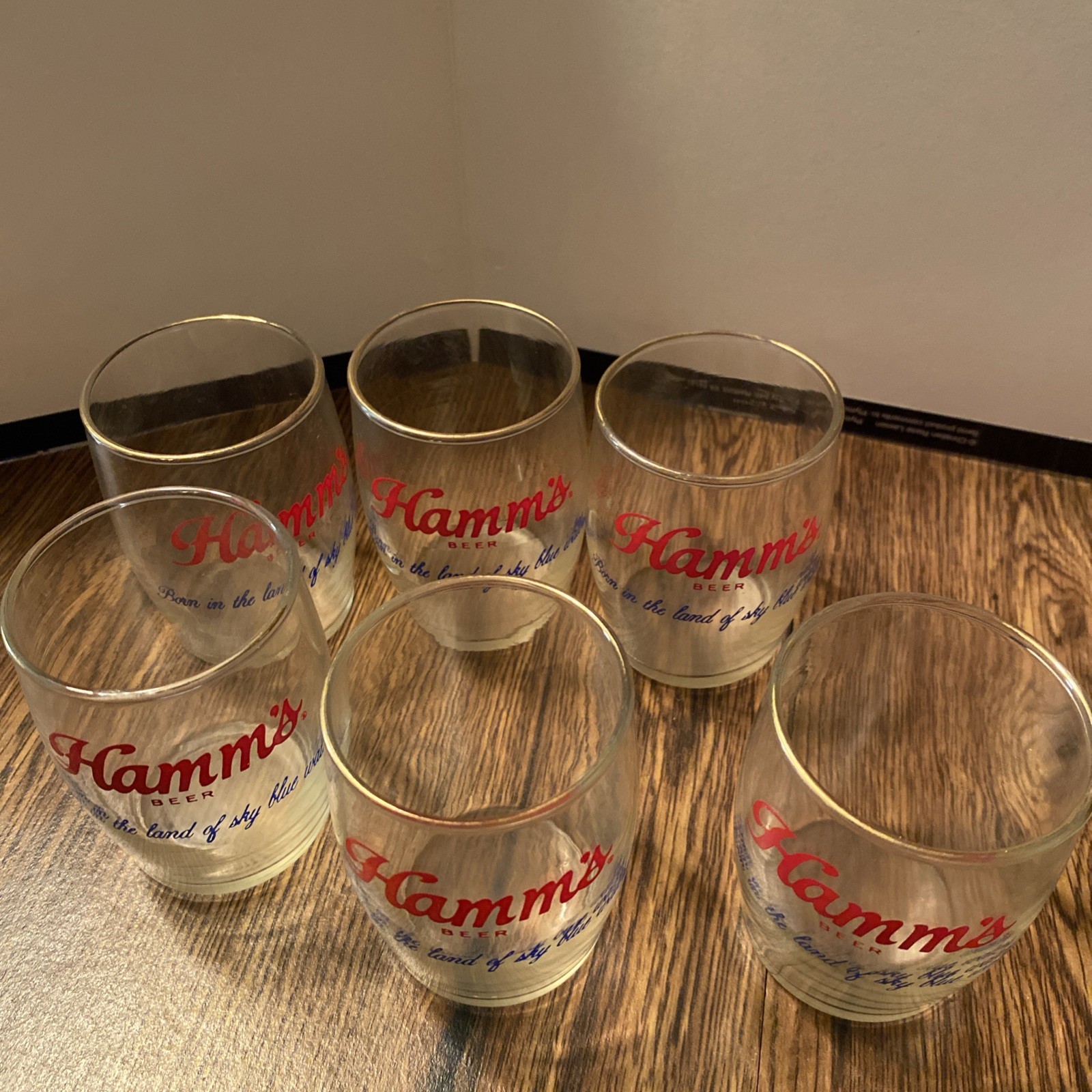 The product is a set of six rare Hamm's beer “Born in the land of sky blue waters” glasses showcasing the iconic brand's logo and theme of breweriana. Made in the United States, these vintage glasses are a collectible piece for fans of Hamm's beer and collectors of unique brew memorabilia. Perfect for serving drinks or displaying as a nostalgic piece of American beer history.