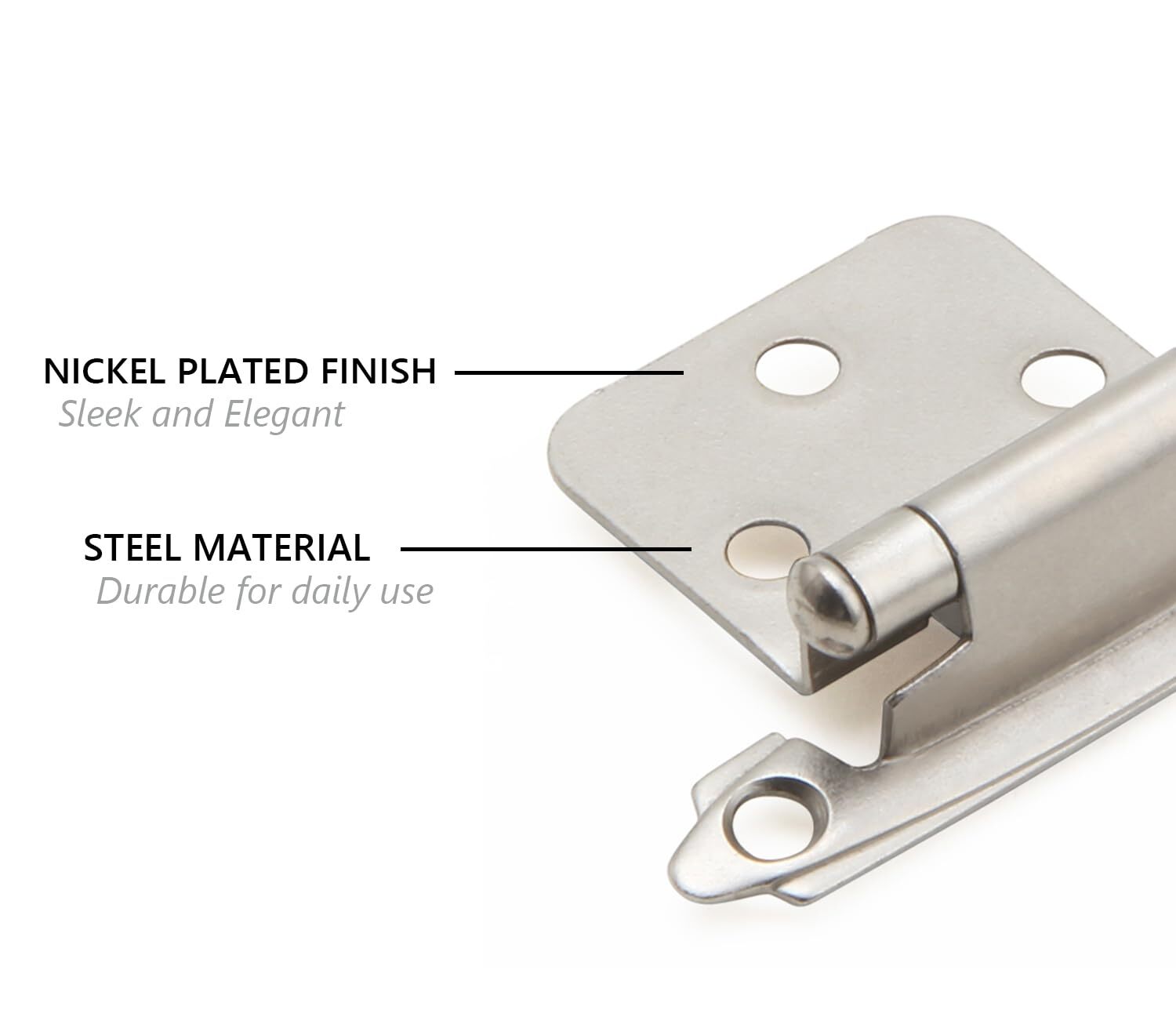 Self(regular) close, variable overlay (face mount) hinge, in Nickel Plated The CENTER to CENTER screwhole dimension for the hinge wing is 2-1/8"(54mm) Face Mount Overlay (Variable). Hole Center to Hole Center. 54 mm ~2-1/8" Package Include: 6 pair (12 pieces) hinges, all necessary mounting screws Money Back . 100% SATISFACTION: If you don’t love your hinges for any reason, let us know and we will your money or send you a .
