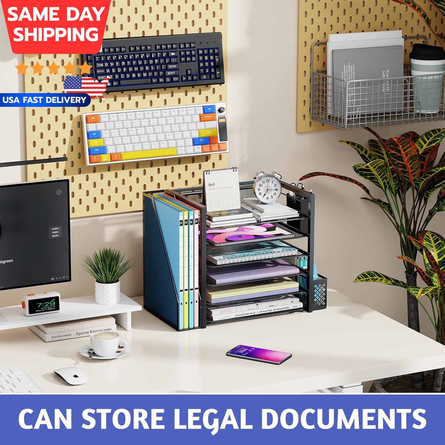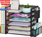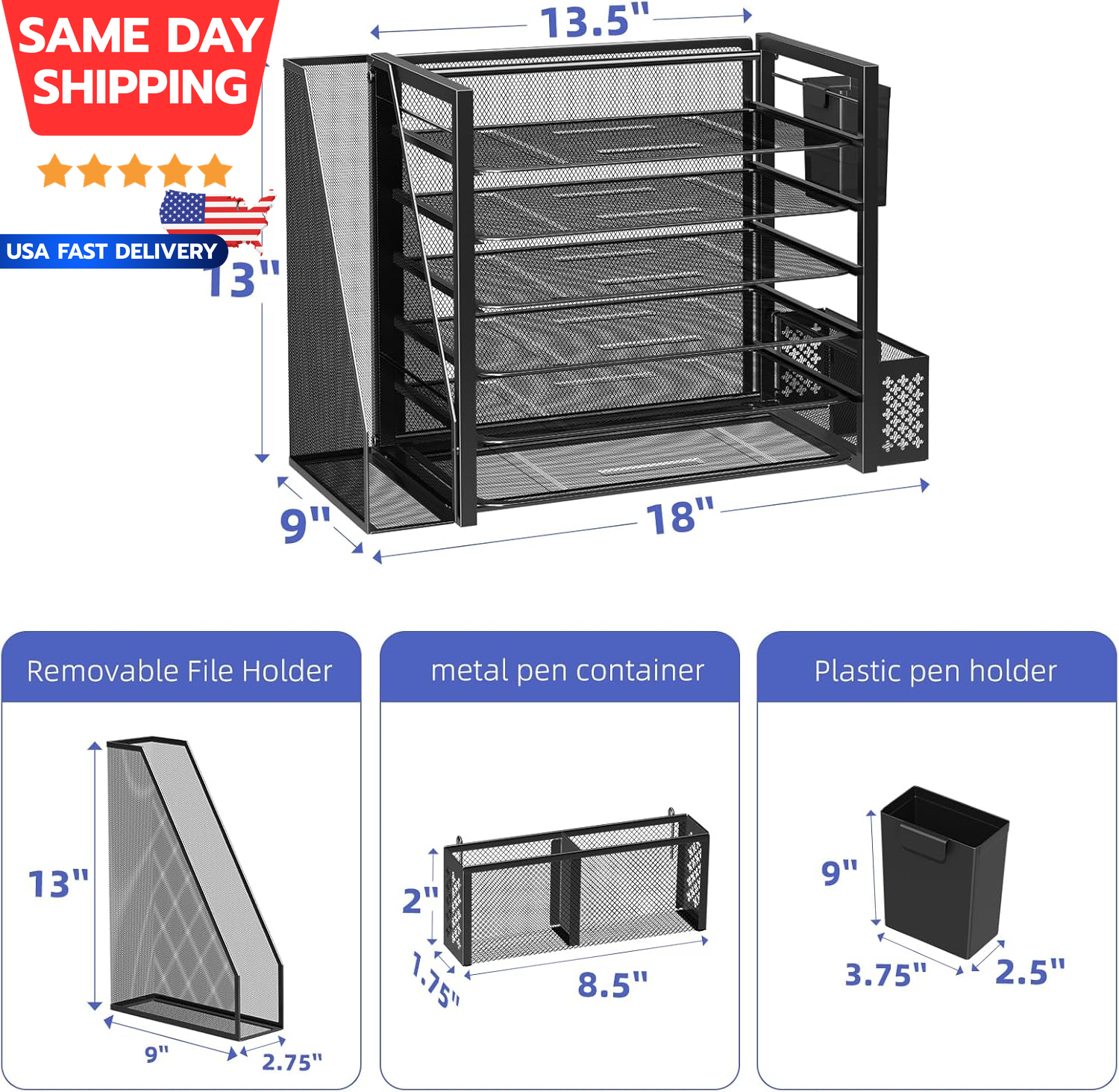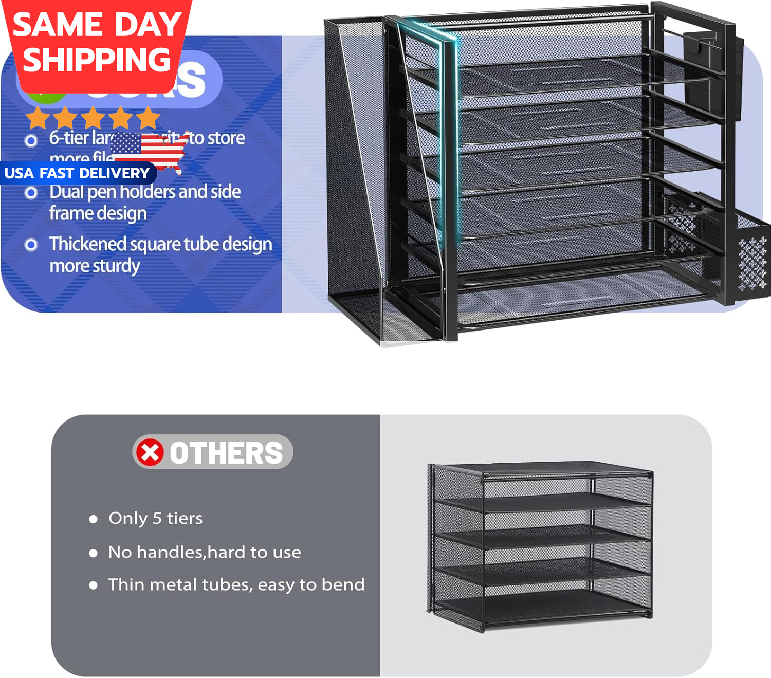 This 6-tier desk organizer is a game-changer for keeping papers, mail, and office supplies neatly sorted! The sturdy metal construction feels durable, and the sleek black lacquered finish adds a modern touch to any workspace. I love how the six tiers provide plenty of space without taking up too much room, and the included pen holder keeps essentials within reach. Assembly was quick and easy, and the non-slip feet keep it stable. Perfect for decluttering and boosting productivity—highly recommend!