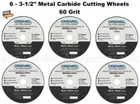 6 - Dremel Ultra Saw Blades, 60 Grit 3-1/2" Metal Carbide Cutting Wheels Dremel Ultra Saw Blades Quantity: 6 Dia.: 3-1/2" Blade Thickness: .049" Grit: 60 RPM: 20000 High performance metal cutting applications Don't apply excessive pressure – the tool does the work Dimensions Dia. (In.) 3 1/2 in Max. Cutting Dia. (In.) 3 1/2 in Flap Wheel Width (In.) 3/64 in Overall Length (In.) 3 1/2 in Blade Dia. 3 1/2 in Details Item Circular Saw Blade Application Metal Cutting Includes Blade For Use With Dremel Ultra Saw Function Cuts Ferrous and Non-Ferrous Materials Number of Pieces 1 Construction Carbide Max. Blade Speed 20,000 RPM Arbor Shape Round Materials Cut Coated Wire Shelving, Conduit, Copper Pipe, Sheet Aluminum, Thin Sheet Metal, Threaded Rod Diamond Knockout No Primary Material Application Ferrous Metal, Nonferrous Metal Accessory Type Circular Saw Blade Customer service is our top priority! Please be sure to read the description thoroughly to make sure that this is the item you want before making a purchasing decision. If you have any questions about this item, please contact us via eBay messages before placing your order. We make every effort possible to accurately describe and depict the items. All items are in stock at the time of listing; however, in the unlikely and unforeseen event that we are unable to fulfill your order through any of our networked warehouses, we will notify you as quickly as possible and offer you a 100% refund on your purchase. We try our very best to make sure every customer is completely satisfied. Your satisfaction is very important to us! If you have any problems with your order, please contact us and we will do our very best to make you satisfied. As long as you are happy with your purchase, please leave positive feedback for us. We will always leave you positive feedback in return. If you have any problems with your purchase, please do not leave negative feedback. Please contact us and your issue will be solved quickly and positively. Thank you for shopping with us. We appreciate your business!