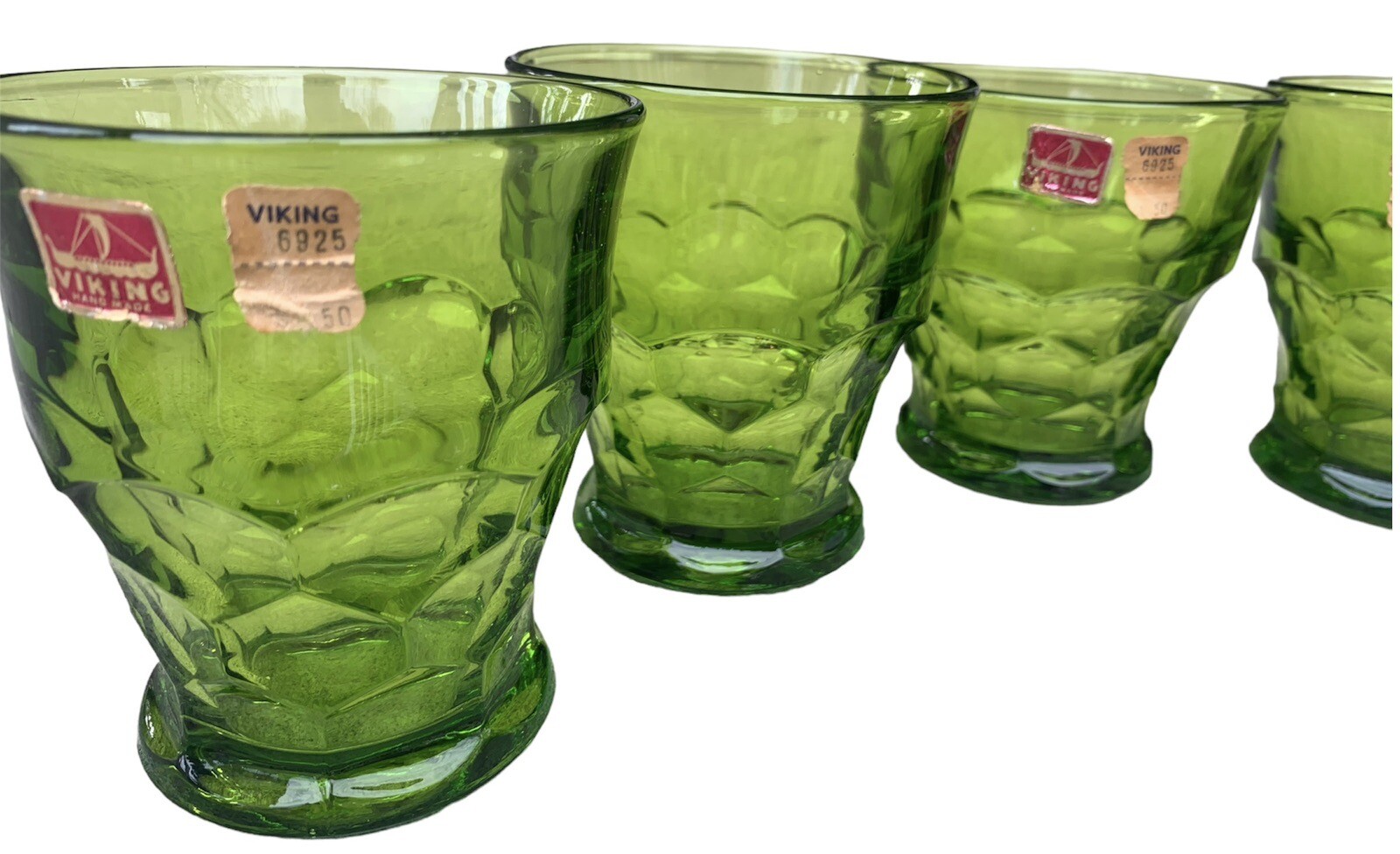 This set of six vintage Viking #6925 honeycomb drinking glasses in emerald green is a must-have for any collector or lover of mid-century modern style. The glasses feature a Georgian-inspired design with a honeycomb pattern, making them both elegant and unique. Tags show wear but are present on all but one glass
