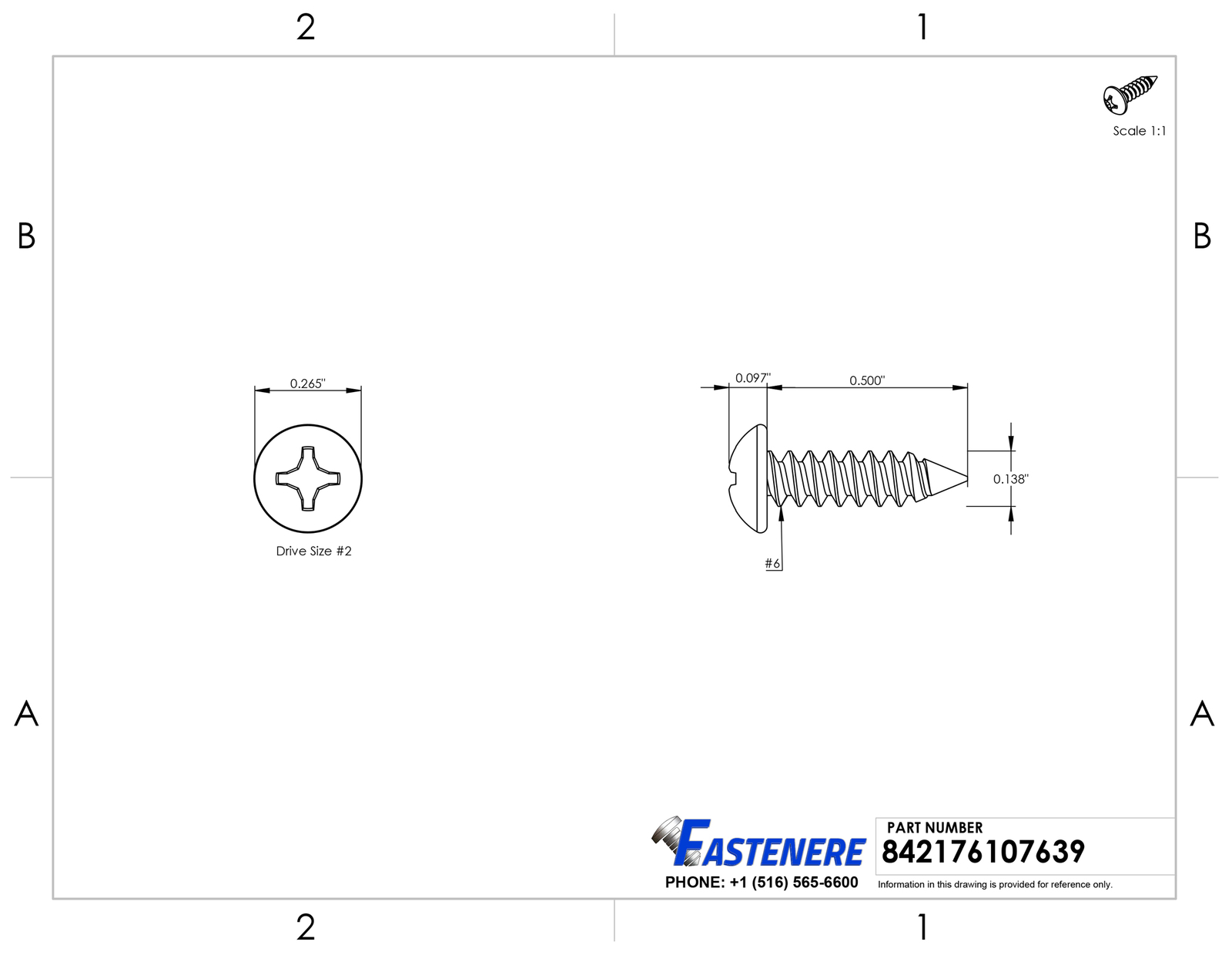 #6 x 1/2" Sheet Metal Screws Self Tapping Pan Head Stainless Steel Qty 2500 Sheet metal screws have sharp threads that cut into a material such as sheet metal, plastic or wood. They also make excellent fasteners for attaching metal hardware to wood because the fully threaded shank provides good retention in wood. About Self tapping Screws A self-tapping screw is a screw that can tap its own hole as it is driven into the material. Some self-tapping screws are also self-drilling, which means that, in addition to the tap-like flute in the leading threads, there is also a preliminary drill-like fluted tip that looks much like the tip of a center drill. The screws in this auction are not "Self Drilling" and do require a pilot hole for a thick gauge material General Product Information Head Style : Pan Drive Style : Phillips Drive Size : #2 Thread : #6 Length : 1/2" Material : Stainless Steel 18-8 Quantity of Fasteners in Package : 2500 Detailed Product Information: Head Diameter : 0.270" Head Height : 0.097" Thread Diameter : 0.138" Thread Coverage : Full Thread Thread Length : 0.50 Point Style : Type A Self-Tapping Key Notes: Stainless steel phillips pan head sheet metal screws will have no problem punching through a thin or light guage sheet metal but will require a pilot hole for a thicker guage metal; the phillips drive has a tendency to slip if there is too much torque applied during installation and these machine screws being made of a high quality stainless steel which is softer than other non corrosion resistant fasteners are also susceptible to stripping so it is recomended to use a slower speed or to set the clutch on the driver so when the machine screw is fastened completely the drill does not shred the phillips drive Phillips pan head sheet metal screws with a self tapping thread patern that forms its own threads in the material it is being screwed into and is mainly used for attatching two pieces of metal together but also works great in wood and plexiglass because of the coarse thread Pan heads have a domed top with a flat load bearing surface on the underside that will hold materials being fastened firmly together Made from stainless steel grade 18-8 which offers a high level of chemical and corrosion resistance that will out perform and out last all zinc plated fasteners for years with out the need to perform costly and time consuming maintenance; 18-8 stainless steel pan head sheet metal screws are a better choice than 410 self drilling screws in out door applications that will be visible because unlike 410 stainless with a high iron content these screws have a low iron content and will not rust or turn red Fastenere brand stainless steel sheet metal screws offer the corrosion resistance and strength that makes them the best choice for an application that is exposed to a wet or damp enviroment and will withstand the test of time Shipping: All orders placed before 3:30 pm EST Will Ship Same Day Tracking is provided on ALL Orders Priority Mail Shipping service is offered at a discount of only $3.95 UPS Ground UPS Next Day Air is available, Please inquire for pricing Returns : ALL returns are accepted if returned within 60 days. Money Back or exchange guaranteed. NO Restocking Fees. For YOU, we constantly strive to find ways to improve our performance.